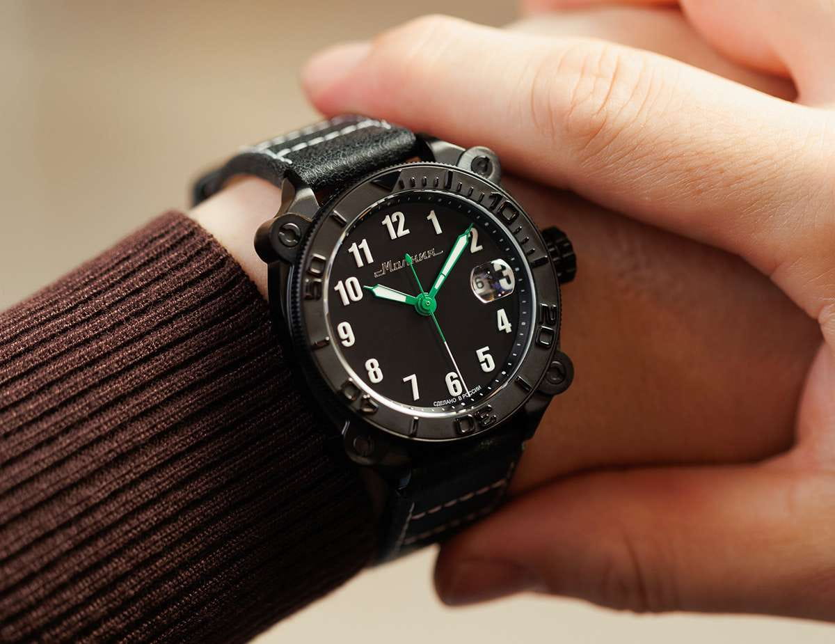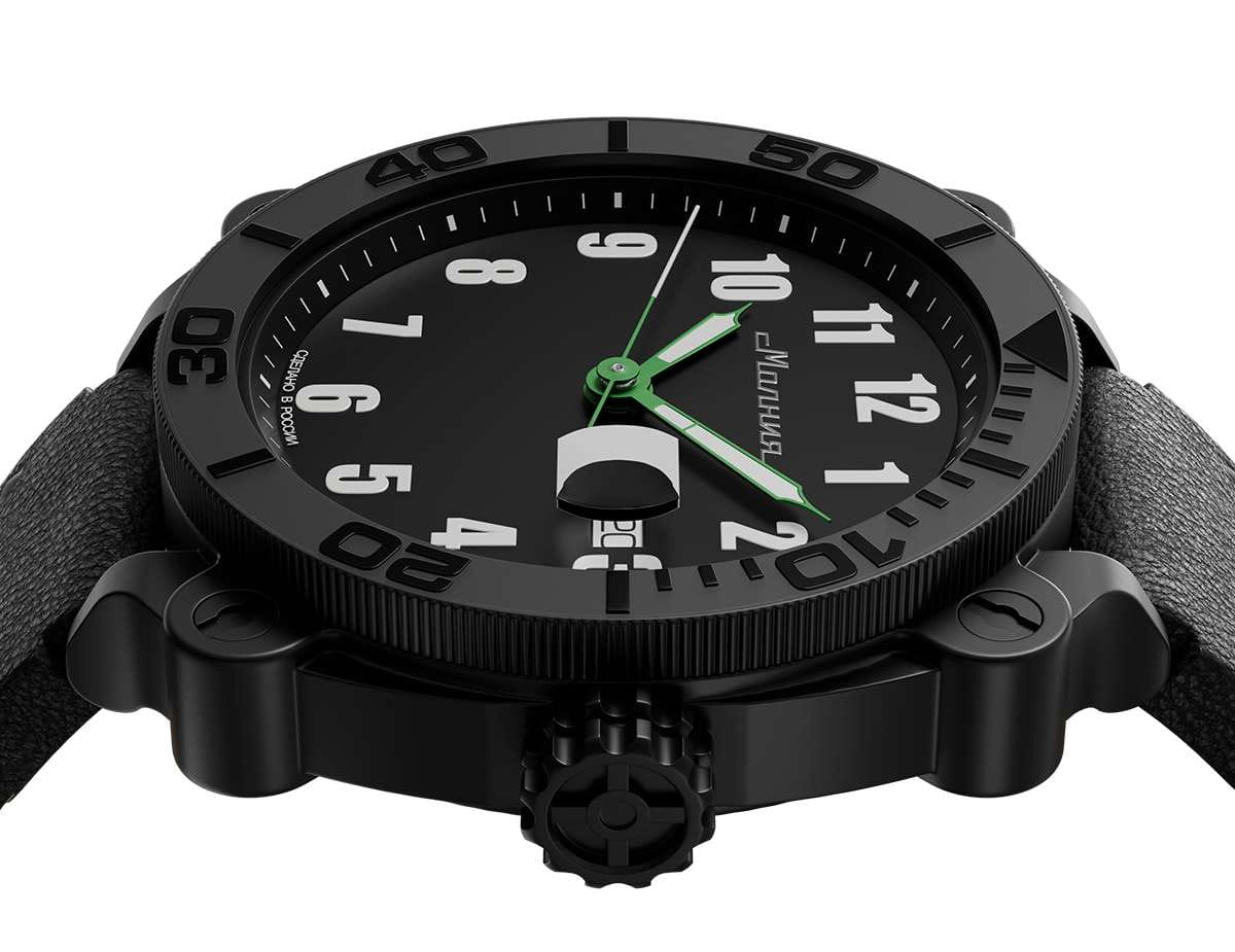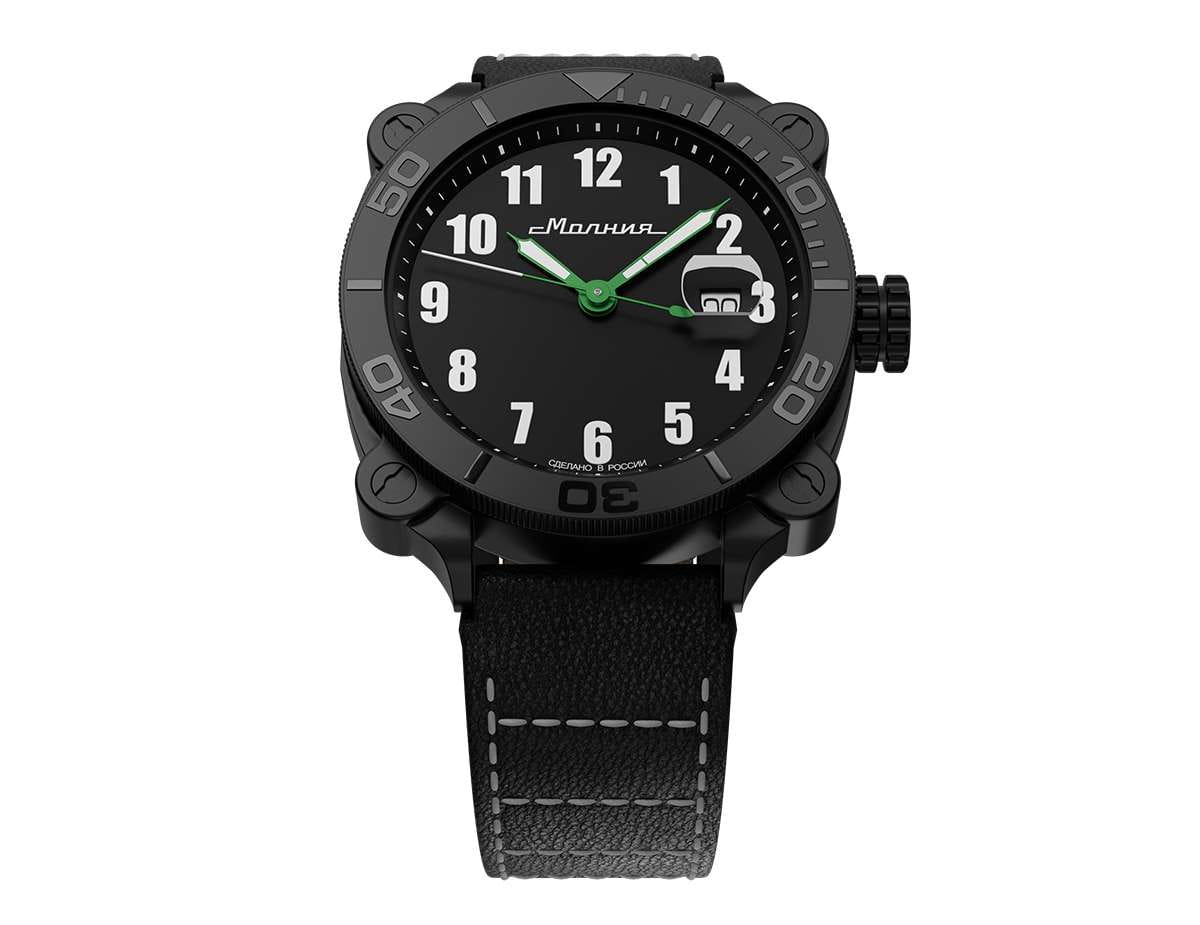Мужские механические часы с автоподзаводом от бренда «МОЛНИЯ» — это стильный аксессуар, вдохновлённый дизайном приборной панели легендарного танка Т-72. Корпус диаметром 42 мм и толщиной 12 мм выполнен из нержавеющей стали 316L с IP-покрытиемIP-покрытиеМетод ионного напыления. Демонстрирует повышенную устойчивость к истиранию, окислению и химическим веществам. Под воздействием высокого давления и температуры около 1500°C молекулы металла надёжно соединяются с частицами корпуса часов.. БезельБезельВнешний ободок, закрепляющий стекло. В спортивных часах так называется поворотное кольцо с делениями на циферблате, выполняет роль таймера – замеряет отрезки времени на шкале. Неподвижный безель – элемент декора. Однонаправленно вращающийся безель на дайверских часах позволяет фиксировать моменты погружения и выныривания на поверхность. однонаправленный, вращающийся. Циферблат чёрного цвета оформлен арабскими цифрами и логотипом бренда. Окошко даты расположено в положении 3 часов и оснащено увеличительным стеклом. Стрелки и метки с люминесцентным покрытиемЛюминесцентное покрытиеПозволяет считывать показания времени в темноте. Производители наносят на стрелки, часовые индексы, безель или поверхность циферблата светонакопительный состав, дающий холодное свечение. Super-LumiNova. Циферблат защищён сапфировым стекломСапфировое стеклоПрочный и надёжный материал из кристалла сапфира синтетического происхождения, характеризующийся особой твёрдостью и устойчивостью к царапинам и повреждениям. с антибликовым покрытиемАнтибликовое покрытиеСлой оксида металла в 0,13-0,3 микрон, благодаря которому стекло часов не бликует и не отражает свет. Антибликовое покрытие уменьшает отражение света в 10 раз, обеспечивая отличную читаемость показателей циферблата.. Механизм — японский автоматический калибр Miyota 8215 запас хода до 42 часов. Заводная головка стилизована под гусеничную ленту, задняя крышка с гравировкой танка Т-72. Часы оснащены кожаным ремешком чёрного цвета с классической пряжкой и системой быстрой замены. Водонепроницаемость 100 м позволяет использовать часы для плавания и повседневного ношения. Идеальный выбор для тех, кто ценит инженерное наследие и мощный дизайн.