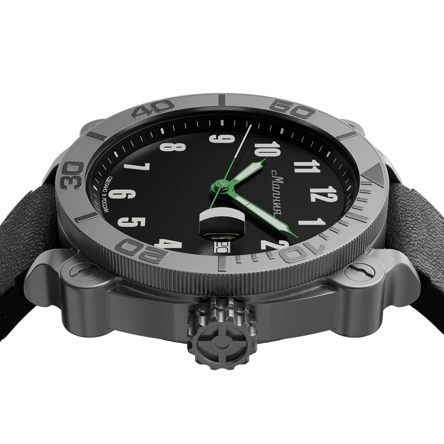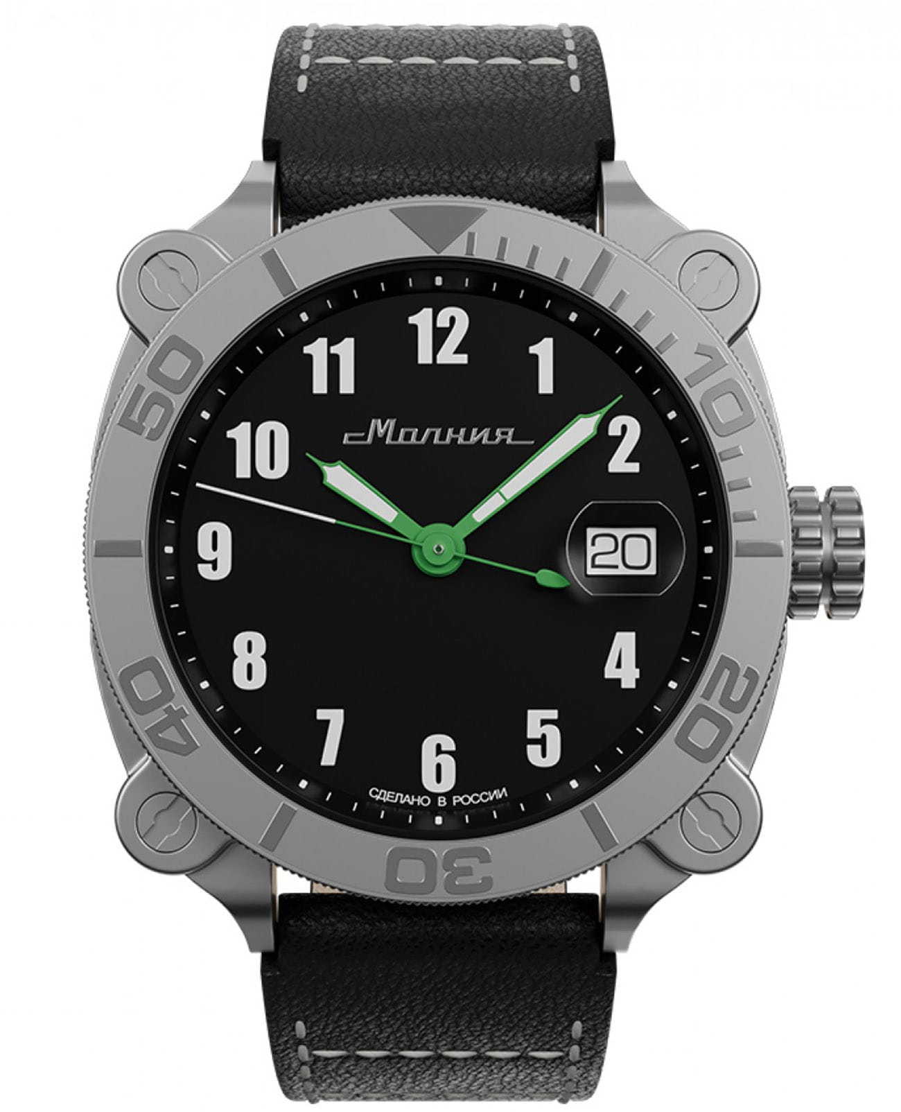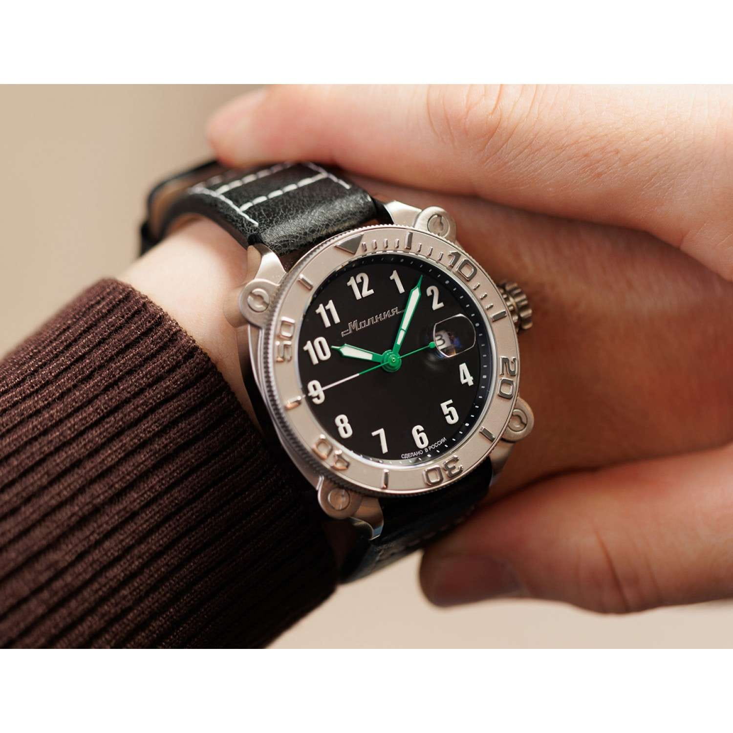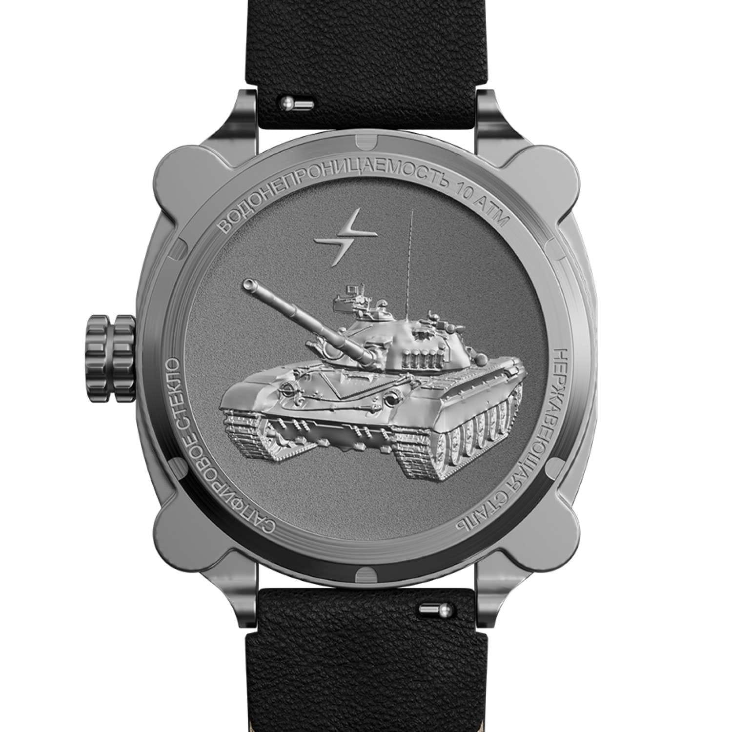 Мужские механические часы с автоподзаводом от бренда «МОЛНИЯ» — это стильный аксессуар, вдохновлённый дизайном приборной панели легендарного танка Т-72. Корпус диаметром 42 мм и толщиной 12 мм выполнен из нержавеющей стали 316L с матовой полировкой. БезельБезельВнешний ободок, закрепляющий стекло. В спортивных часах так называется поворотное кольцо с делениями на циферблате, выполняет роль таймера – замеряет отрезки времени на шкале. Неподвижный безель – элемент декора. Однонаправленно вращающийся безель на дайверских часах позволяет фиксировать моменты погружения и выныривания на поверхность. однонаправленный, вращающийся. Циферблат чёрного цвета оформлен арабскими цифрами и логотипом бренда. Окошко даты расположено в положении 3 часов и оснащено увеличительным стеклом. Стрелки и метки с люминесцентным покрытиемЛюминесцентное покрытиеПозволяет считывать показания времени в темноте. Производители наносят на стрелки, часовые индексы, безель или поверхность циферблата светонакопительный состав, дающий холодное свечение. Super-LumiNova. Циферблат защищён сапфировым стекломСапфировое стеклоПрочный и надёжный материал из кристалла сапфира синтетического происхождения, характеризующийся особой твёрдостью и устойчивостью к царапинам и повреждениям. с антибликовым покрытиемАнтибликовое покрытиеСлой оксида металла в 0,13-0,3 микрон, благодаря которому стекло часов не бликует и не отражает свет. Антибликовое покрытие уменьшает отражение света в 10 раз, обеспечивая отличную читаемость показателей циферблата.. Механизм — Русский автоматический калибр Восток 2416 запас хода до 42 часов. Заводная головка стилизована под гусеничную ленту, задняя крышка с гравировкой танка. Часы оснащены кожаным ремешком чёрного цвета с классической пряжкой и системой быстрой замены. Водонепроницаемость 100 м позволяет использовать часы для плавания и повседневного ношения. Идеальный выбор для тех, кто ценит инженерное наследие и мощный дизайн.