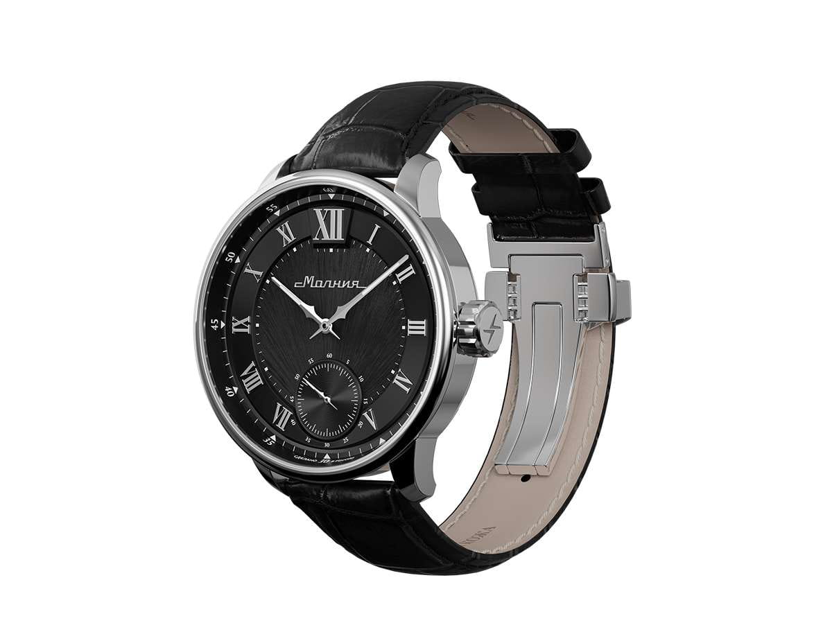 Мужские механические часы с ручным подзаводом — это аксессуар от легендарного бренда «МОЛНИЯ», созданный на Челябинском часовом заводе. Корпус диаметром 41 мм и толщиной 12 мм выполнен из нержавеющей стали 316L с зеркальной полировкой. БезельБезельВнешний ободок, закрепляющий стекло. В спортивных часах так называется поворотное кольцо с делениями на циферблате, выполняет роль таймера – замеряет отрезки времени на шкале. Неподвижный безель – элемент декора. Однонаправленно вращающийся безель на дайверских часах позволяет фиксировать моменты погружения и выныривания на поверхность. также выполнен из стали с зеркальной отделкой. Циферблат чёрного цвета оформлен римскими цифрами и стальными индексами. Малая секундная стрелка вынесена на позицию 6 часов. Циферблат защищён сапфировым стекломСапфировое стеклоПрочный и надёжный материал из кристалла сапфира синтетического происхождения, характеризующийся особой твёрдостью и устойчивостью к царапинам и повреждениям. толщиной 2,5 мм. Механизм — мануфактурный калибр 3603, собранный вручную, с запасом хода до 40 часов. Прозрачная задняя крышка позволяет наблюдать за работой механизма. Часы оснащены чёрным кожаным ремешком шириной 20 мм с раскладной застёжкойРаскладная застёжкаТакой тип застёжки используется только на браслетах из металла. Она никогда не раскрывается полностью, происходит разделение на 2 и более частей. Раскладывающая застёжка снизит вероятность потери часов к минимуму. и системой быстрой замены. Водонепроницаемость 100 м позволяет использовать часы для плавания и повседневного ношения. Идеальный выбор для тех, кто ценит российское качество и традиции.