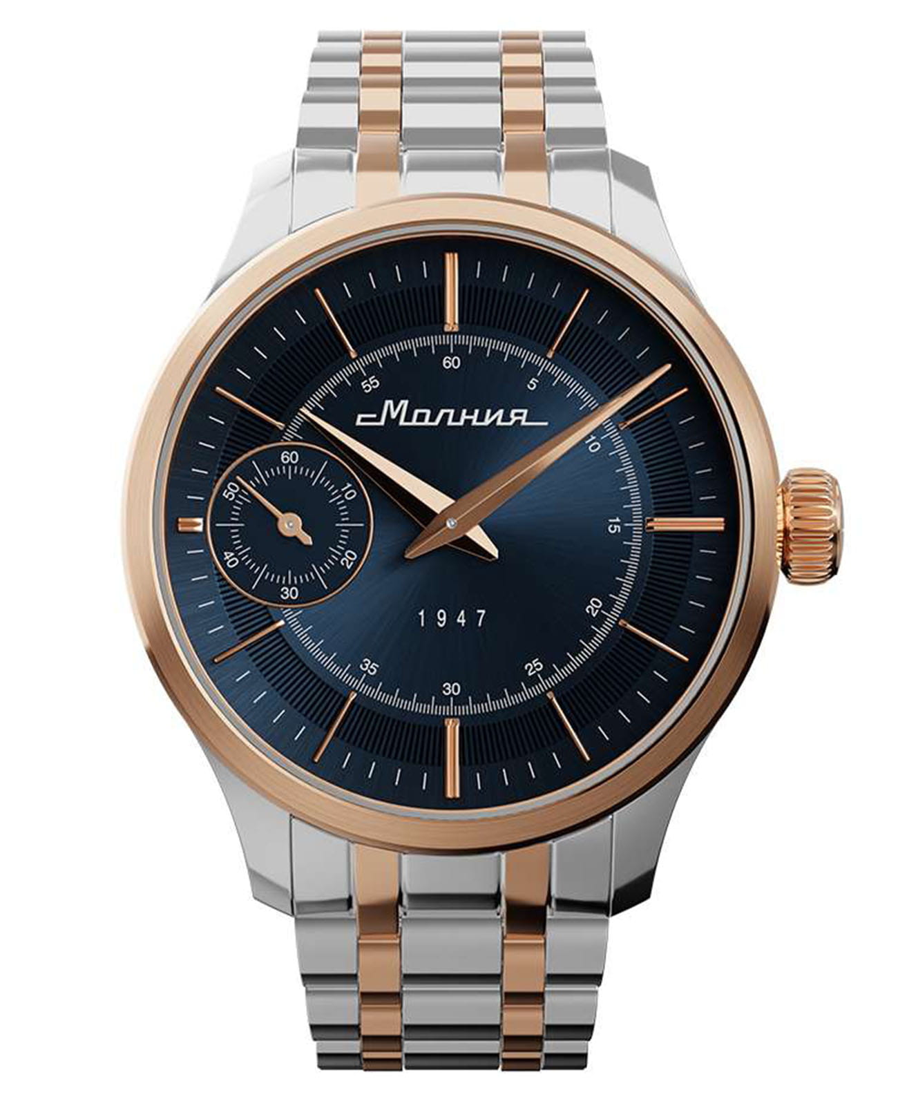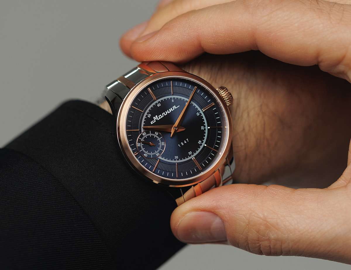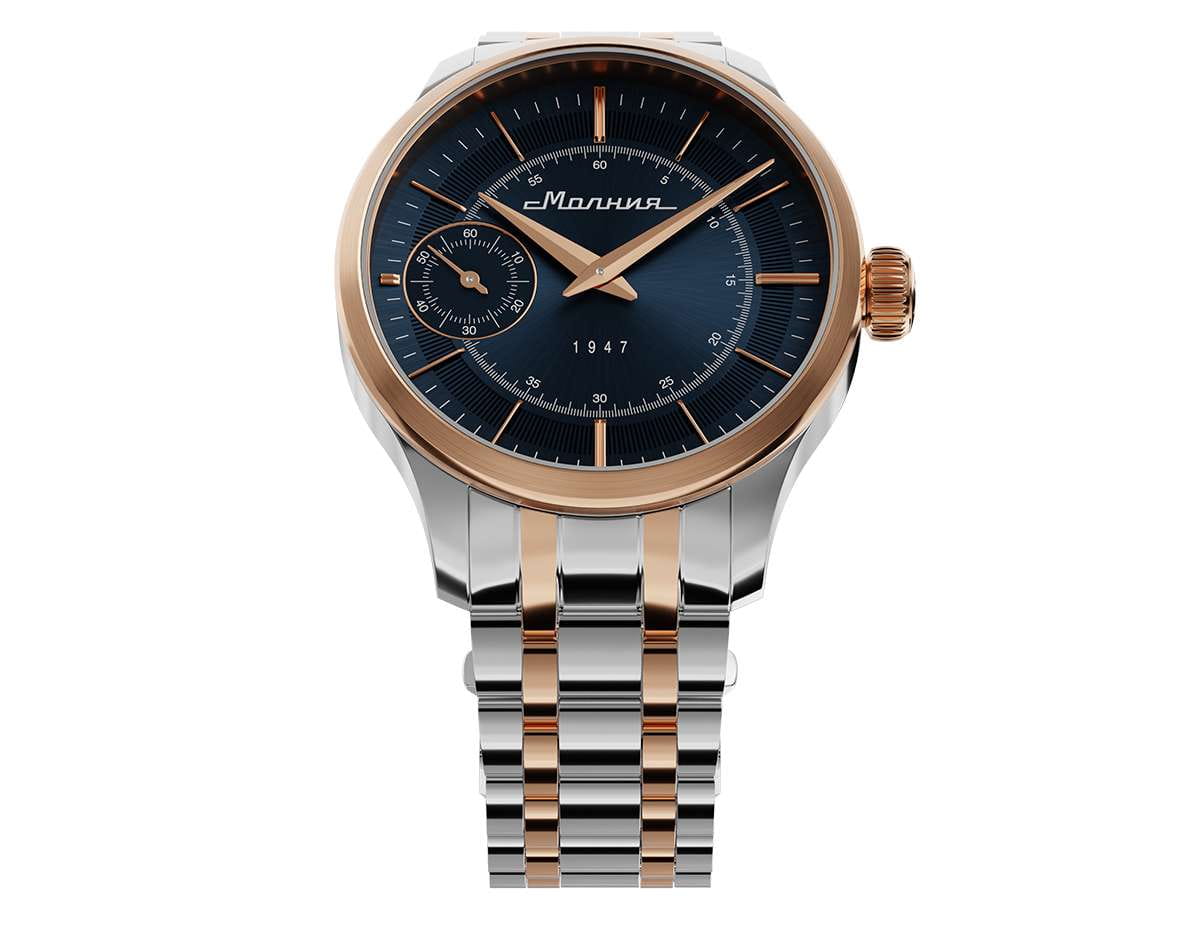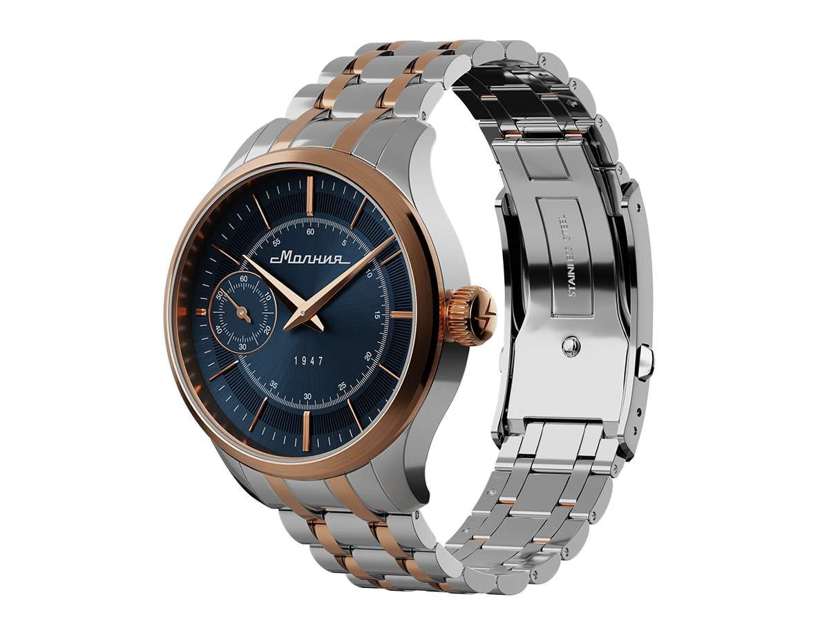 Мужские механические часы с ручным подзаводом — это аксессуар от легендарного бренда «МОЛНИЯ», созданный на Челябинском часовом заводе. Корпус диаметром 41 мм выполнен из нержавеющей стали 316L. БезельБезельВнешний ободок, закрепляющий стекло. В спортивных часах так называется поворотное кольцо с делениями на циферблате, выполняет роль таймера – замеряет отрезки времени на шкале. Неподвижный безель – элемент декора. Однонаправленно вращающийся безель на дайверских часах позволяет фиксировать моменты погружения и выныривания на поверхность. выполнен из стали с PVD-покрытиемPVDУльтратонкое покрытие наносится в технике вакуумного напыления, сочетает в себе нитрид титана особой прочности со слоем золота или оксида хрома. Несёт в себе декоративную или защитную функцию. и зеркальной отделкой. Циферблат синего цвета оформлен индексами и стрелками. Малая секундная стрелка вынесена на позицию 9 часов. Циферблат защищён сапфировым стекломСапфировое стеклоПрочный и надёжный материал из кристалла сапфира синтетического происхождения, характеризующийся особой твёрдостью и устойчивостью к царапинам и повреждениям. толщиной 2 мм. Механизм — мануфактурный калибр 3603, собранный вручную, с запасом хода до 40 часов. Прозрачная задняя крышка позволяет наблюдать за работой механизма. Часы оснащены стальным браслетом с частичным PVD-покрытиемPVDУльтратонкое покрытие наносится в технике вакуумного напыления, сочетает в себе нитрид титана особой прочности со слоем золота или оксида хрома. Несёт в себе декоративную или защитную функцию. под золото и системой быстрой замены на раскладной застёжкеРаскладная застёжкаТакой тип застёжки используется только на браслетах из металла. Она никогда не раскрывается полностью, происходит разделение на 2 и более частей. Раскладывающая застёжка снизит вероятность потери часов к минимуму. типа клипса. Водонепроницаемость 50 м позволяет использовать часы в повседневных условиях. Идеальный выбор для тех, кто ценит российское качество и традиции.