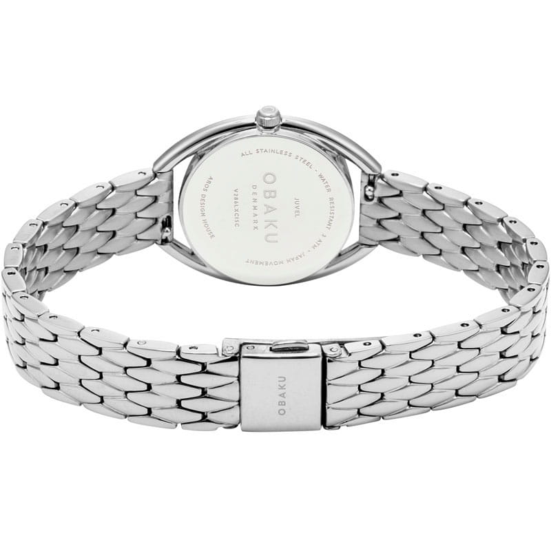 Женские наручные кварцевые часы с минеральным стекломМинеральное стеклоМинеральное стекло представляет собой искусственно выращенный минерал кварца. Такое стекло отличается особой устойчивостью к повреждениям и царапинам. Уступает по некоторым качествам сапфировому стеклу. Obaku Diamond V286LXCISC, кварцевый механизм с высокой точностью. Класс водозащиты: 30 метров, позволит защитить корпус от случайных брызг или капель дождя. Корпус часов изготовлен из стали. Стальной браслет на раскладной застёжкеРаскладная застёжкаТакой тип застёжки используется только на браслетах из металла. Она никогда не раскрывается полностью, происходит разделение на 2 и более частей. Раскладывающая застёжка снизит вероятность потери часов к минимуму.. Белый циферблат декорирован бриллиантом.