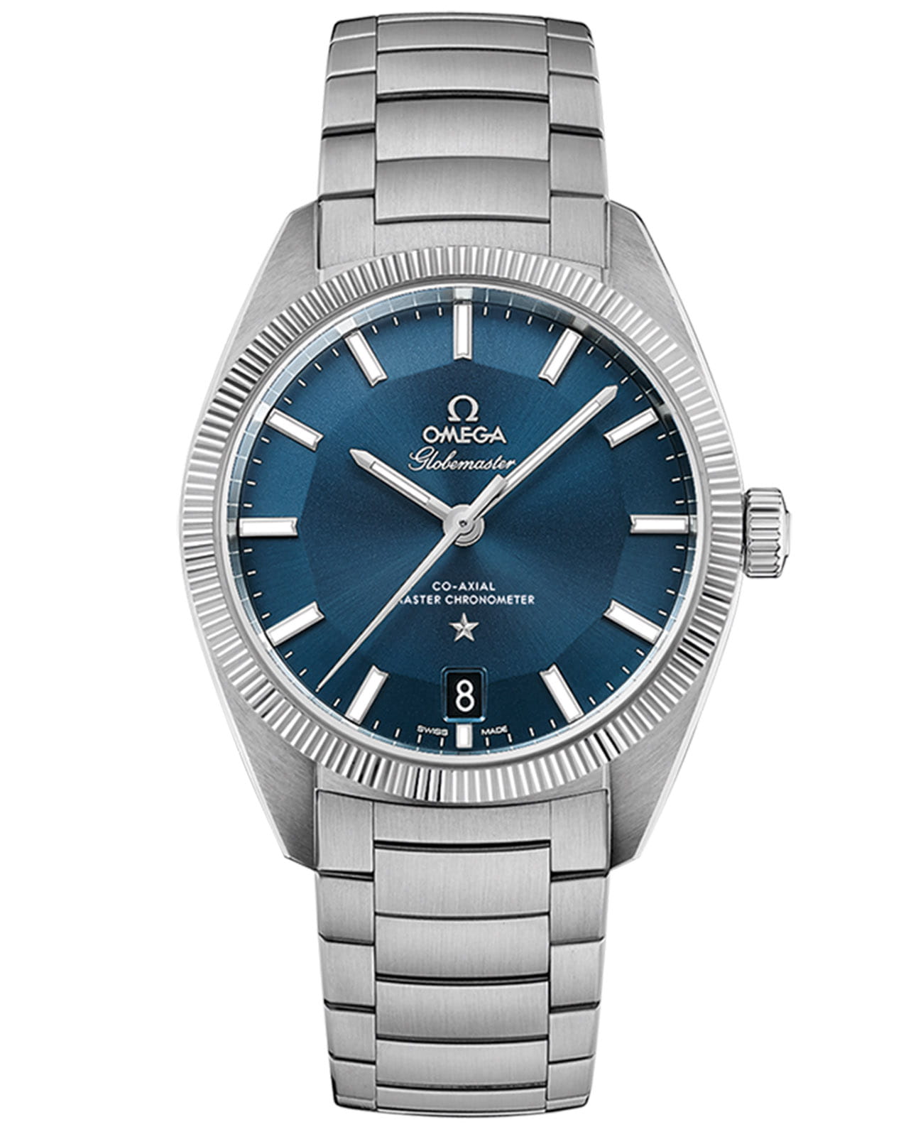 Часы Globemaster – живая легенда часового искусства OMEGA. Усовершенствованная версия, ставшая первым в мире сертифицированным мастер-хронометром, подтверждает статус безупречного хронометра. Эти часы привлекают внимание ценителей не только новым стандартом точности, но и изысканной лаконичностью дизайна. Корпус из нержавеющей стали гармонично сочетается с рифленым безелемБезельВнешний ободок, закрепляющий стекло. В спортивных часах так называется поворотное кольцо с делениями на циферблате, выполняет роль таймера – замеряет отрезки времени на шкале. Неподвижный безель – элемент декора. Однонаправленно вращающийся безель на дайверских часах позволяет фиксировать моменты погружения и выныривания на поверхность. из сверхпрочного металла, а циферблат украшают фирменная звезда, стрелки и индексы с родиевым покрытием, дополненные люминесцентным составомЛюминесцентное покрытиеПозволяет считывать показания времени в темноте. Производители наносят на стрелки, часовые индексы, безель или поверхность циферблата светонакопительный состав, дающий холодное свечение.. Задняя крышка с медальоном Женевской обсерватории и синий циферблат с радиальной сатинировкой отсылают к первой модели Constellation 1952 года. Облик завершает трехрядный браслет из нержавеющей стали с изогнутыми звеньями, а сердцем служит коаксиальный хронометр  OMEGA Master Chronometer 8900 с инновационной антимагнитной защитой.