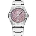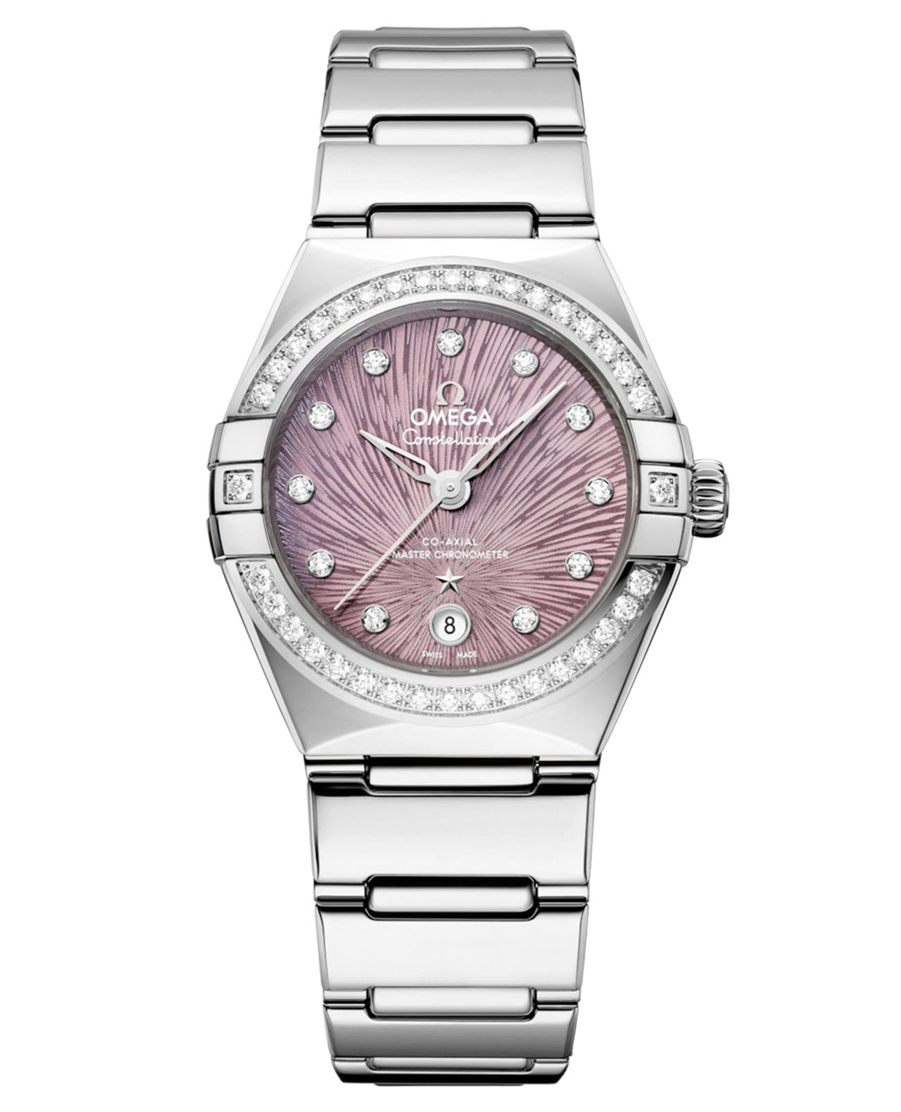 Легендарные высокоточные часы OMEGA Constellation, вдохновленные загадочным мерцанием звезд в ночном небе, заключены в корпус узнаваемой формы с полукруглыми скосами и полированными скобами по бокам. Модель диаметром 29 мм выполнена из нержавеющей стали и оснащена сияющим безелемБезельВнешний ободок, закрепляющий стекло. В спортивных часах так называется поворотное кольцо с делениями на циферблате, выполняет роль таймера – замеряет отрезки времени на шкале. Неподвижный безель – элемент декора. Однонаправленно вращающийся безель на дайверских часах позволяет фиксировать моменты погружения и выныривания на поверхность. с бриллиантовым паве. Циферблат сиреневого цвета с PVDPVDУльтратонкое покрытие наносится в технике вакуумного напыления, сочетает в себе нитрид титана особой прочности со слоем золота или оксида хрома. Несёт в себе декоративную или защитную функцию.-покрытием и фирменным узором Supernova, нанесенным методом электрохимического травления, дополнен окошком даты в положении «6 часов», стрелками и звездой из 18-каратного белого золота18-каратное золотоОбозначение по каратной системе пробирования, оно показывает, сколько драгоценного металла содержится в изделии. 18 карат - в составе 75% чистого золота, соответствует 750 пробе.