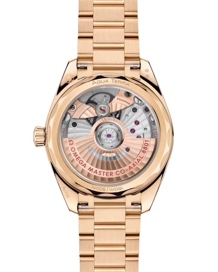 Часы Omega Seamaster Aqua Terra выполнены в симметричном корпусе из полированного 18K Moonshine™ золота с завинчивающейся задней крышкой, украшенной волновым узором. Модель дополнена конической заводной головкой и окошком даты на 6 часах, окаймлённым кольцом из 18K Moonshine™ золота. Циферблат серебристого цвета оформлен с использованием солнечной шлифовки, стрелки и метки выполнены из 18K Moonshine™ золота и оснащены люминесцентным покрытиемЛюминесцентное покрытиеПозволяет считывать показания времени в темноте. Производители наносят на стрелки, часовые индексы, безель или поверхность циферблата светонакопительный состав, дающий холодное свечение. Super-LumiNova для лучшей читаемости в темноте. Индексы выполнены в форме корпусов парусников — деталь, подчёркивающая морское наследие коллекции. Калибр Omega 8801 сертифицирован как Master Chronometer — гарантия высочайшей точности и устойчивости к магнитным полям. Запас хода составляет 55 часов. Защиту циферблата обеспечивает сапфировое стеклоСапфировое стеклоПрочный и надёжный материал из кристалла сапфира синтетического происхождения, характеризующийся особой твёрдостью и устойчивостью к царапинам и повреждениям. с антибликовым покрытиемАнтибликовое покрытиеСлой оксида металла в 0,13-0,3 микрон, благодаря которому стекло часов не бликует и не отражает свет. Антибликовое покрытие уменьшает отражение света в 10 раз, обеспечивая отличную читаемость показателей циферблата. с обеих сторон. Водозащита позволяет использовать часы в воде без риска повреждения. Часы установлены на браслет из 18K Moonshine™ золота с раскладной застёжкойРаскладная застёжкаТакой тип застёжки используется только на браслетах из металла. Она никогда не раскрывается полностью, происходит разделение на 2 и более частей. Раскладывающая застёжка снизит вероятность потери часов к минимуму.. Вес модели — около 157 грамм. Это сочетание премиального качества, технологичности и классического дизайна.