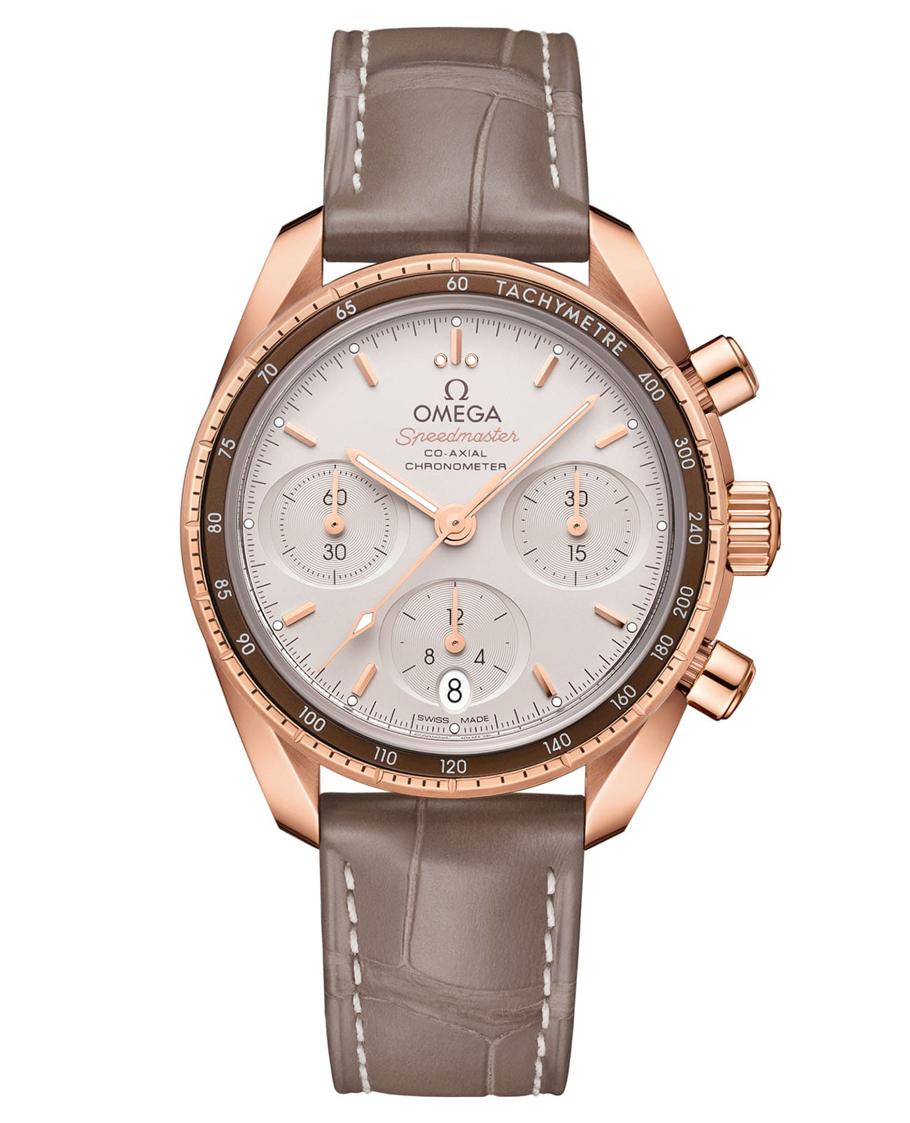 обрамляет безельБезельВнешний ободок, закрепляющий стекло. В спортивных часах так называется поворотное кольцо с делениями на циферблате, выполняет роль таймера – замеряет отрезки времени на шкале. Неподвижный безель – элемент декора. Однонаправленно вращающийся безель на дайверских часах позволяет фиксировать моменты погружения и выныривания на поверхность. с изысканным чередованием полированных и матовых поверхностей, где на коричневом алюминиевом кольце размещена тахиметрическая шкалаТахиметрРазмеченная шкала, располагается на ободке или безеле часов. Тахиметр позволяет рассчитать скорость на определённом участке пути, расстояние измеряется в километрах или милях..