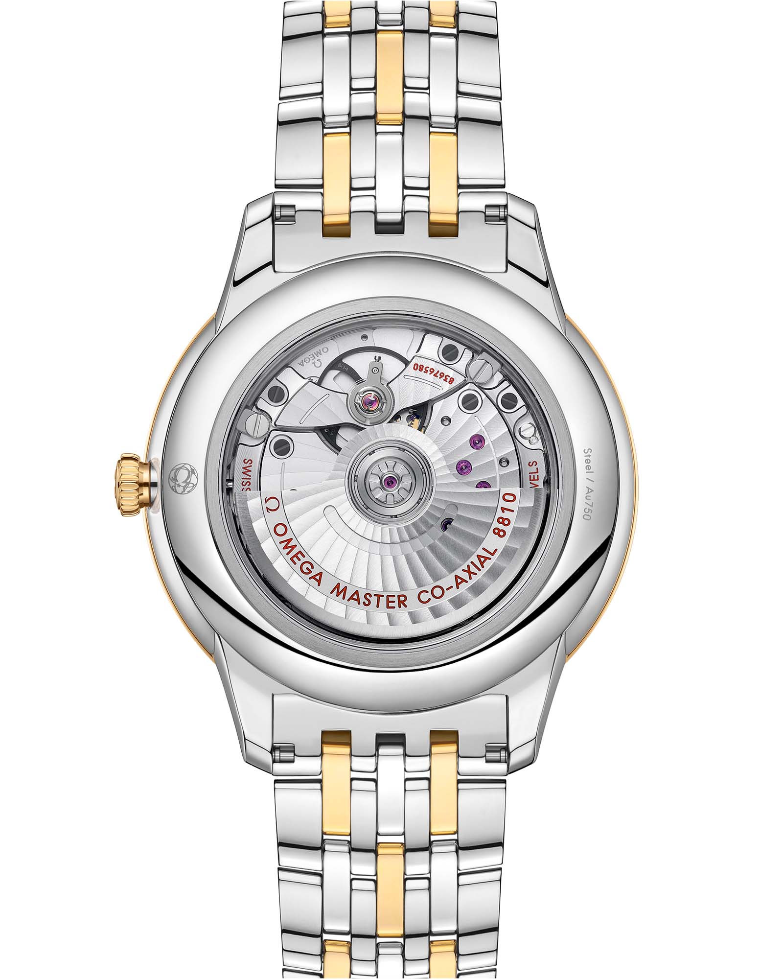 . Модель оснащена калибром OMEGA Master Co-Axial 8810, который виден сквозь устойчивое к царапинам сапфировое стеклоСапфировое стеклоПрочный и надёжный материал из кристалла сапфира синтетического происхождения, характеризующийся особой твёрдостью и устойчивостью к царапинам и повреждениям. задней крышки корпуса.