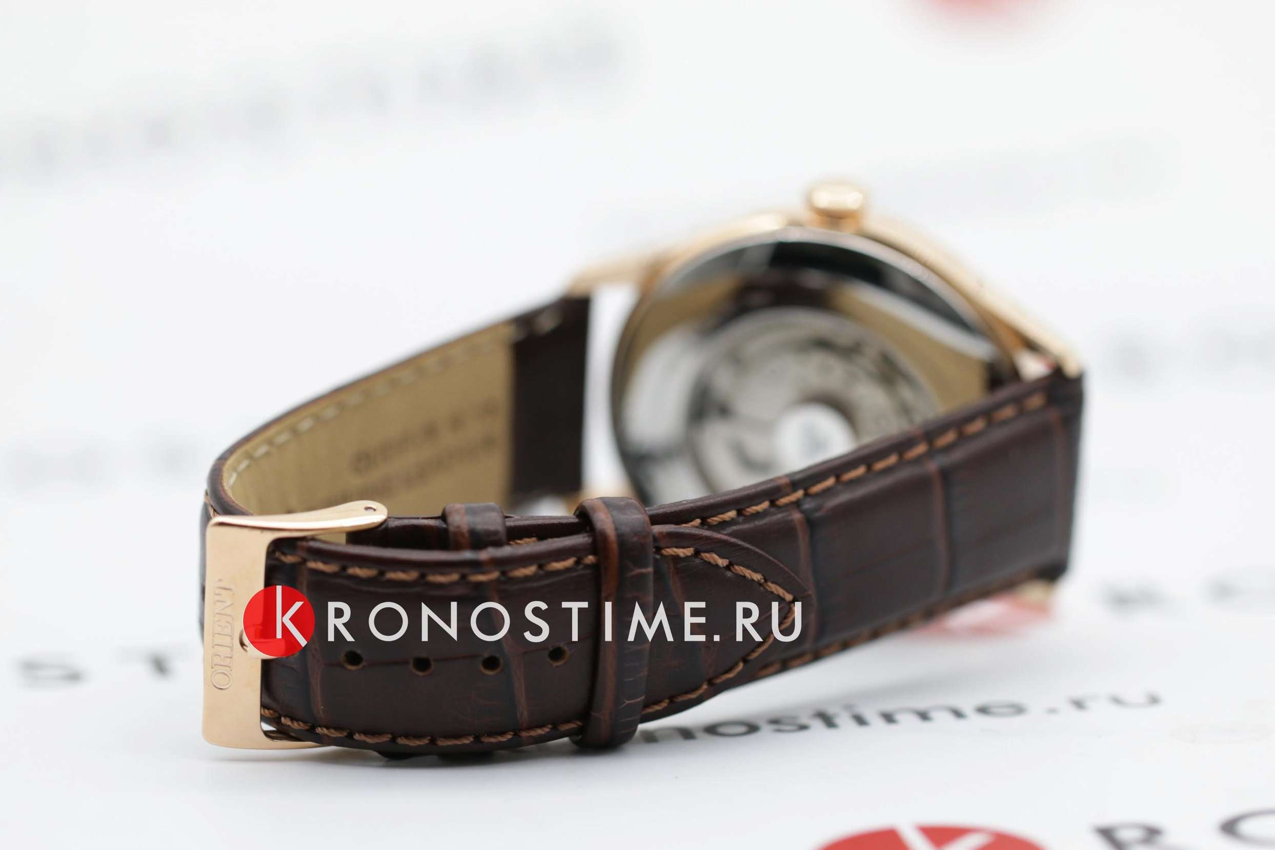 Orient Classic Open Heart AG00001S — это элегантные классические часы с утонченным дизайном и надежным механизмом. Корпус диаметром 43 мм выполнен из нержавеющей стали с PVD-покрытиемPVDУльтратонкое покрытие наносится в технике вакуумного напыления, сочетает в себе нитрид титана особой прочности со слоем золота или оксида хрома. Несёт в себе декоративную или защитную функцию. розового цвета, что придает модели изысканный и благородный вид. Циферблат шампанского оттенка украшен римскими цифрами и черными стрелками, обеспечивая четкость отображения времени. Окошко "Open Heart" на отметке 9 часов позволяет наблюдать за работой механизма. Защиту циферблата обеспечивает минеральное стеклоМинеральное стеклоМинеральное стекло представляет собой искусственно выращенный минерал кварца. Такое стекло отличается особой устойчивостью к повреждениям и царапинам. Уступает по некоторым качествам сапфировому стеклу. с выпуклой формой. Внутри установлен автоматический механизм Orient калибра F6T22 с возможностью ручного подзавода и функцией стоп-секунды, обеспечивающий точность и запас хода до 40 часов. Модель комплектуется коричневым кожаным ремешком с тиснением под крокодила, а классическая застёжка обеспечивает комфортное и надежное ношение. Водонепроницаемость 50 метров защищает часы от брызг и кратковременного контакта с водой, делая их идеальным выбором для повседневного использования.