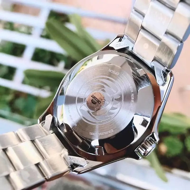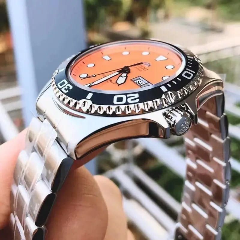 Мужские механические часы с автоподзаводом Orient Automatic AA02006M. Минеральное стеклоМинеральное стеклоМинеральное стекло представляет собой искусственно выращенный минерал кварца. Такое стекло отличается особой устойчивостью к повреждениям и царапинам. Уступает по некоторым качествам сапфировому стеклу. устойчивое к появлению царапин, обладающее высокой прозрачностью. Корпус из нержавеющей стали. Вращающийся безельБезельВнешний ободок, закрепляющий стекло. В спортивных часах так называется поворотное кольцо с делениями на циферблате, выполняет роль таймера – замеряет отрезки времени на шкале. Неподвижный безель – элемент декора. Однонаправленно вращающийся безель на дайверских часах позволяет фиксировать моменты погружения и выныривания на поверхность. из нержавеющей стали с PVDPVDУльтратонкое покрытие наносится в технике вакуумного напыления, сочетает в себе нитрид титана особой прочности со слоем золота или оксида хрома. Несёт в себе декоративную или защитную функцию. покрытием. Окошко даты в положении 3 часов. Стрелки с люминесцентным покрытиемЛюминесцентное покрытиеПозволяет считывать показания времени в темноте. Производители наносят на стрелки, часовые индексы, безель или поверхность циферблата светонакопительный состав, дающий холодное свечение.. Класс водозащиты: 200 метров, позволит плавать, нырять и заниматься другими водными видами спорта. Стальной браслет на раскладной застёжкеРаскладная застёжкаТакой тип застёжки используется только на браслетах из металла. Она никогда не раскрывается полностью, происходит разделение на 2 и более частей. Раскладывающая застёжка снизит вероятность потери часов к минимуму..