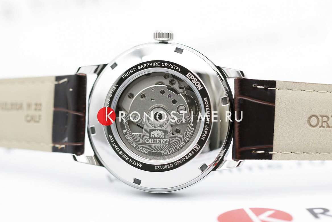Orient RA-AC0F12S — элегантные механические часы, сочетающие классический стиль и надёжность. Корпус диаметром 41,6 мм выполнен из нержавеющей стали, что придаёт модели прочность и долговечность. Светлый циферблат украшен накладными часовыми индексами и стрелками с люминесцентным покрытиемЛюминесцентное покрытиеПозволяет считывать показания времени в темноте. Производители наносят на стрелки, часовые индексы, безель или поверхность циферблата светонакопительный состав, дающий холодное свечение., обеспечивающим превосходную читаемость. Окошко даты расположено на отметке «3 часа» для удобства. Защиту циферблата обеспечивает сапфировое стеклоСапфировое стеклоПрочный и надёжный материал из кристалла сапфира синтетического происхождения, характеризующийся особой твёрдостью и устойчивостью к царапинам и повреждениям., устойчивое к царапинам. Внутри установлен автоматический механизм Orient калибра F6722 с возможностью ручного завода и функцией стоп-секунды, обеспечивающий точность хода и запас энергии до 40 часов. Часы укомплектованы коричневым кожаным ремешком, а классическая застёжка-пряжка гарантирует удобную фиксацию на запястье. Водонепроницаемость 50 метров делает модель надёжным спутником в повседневной жизни.
