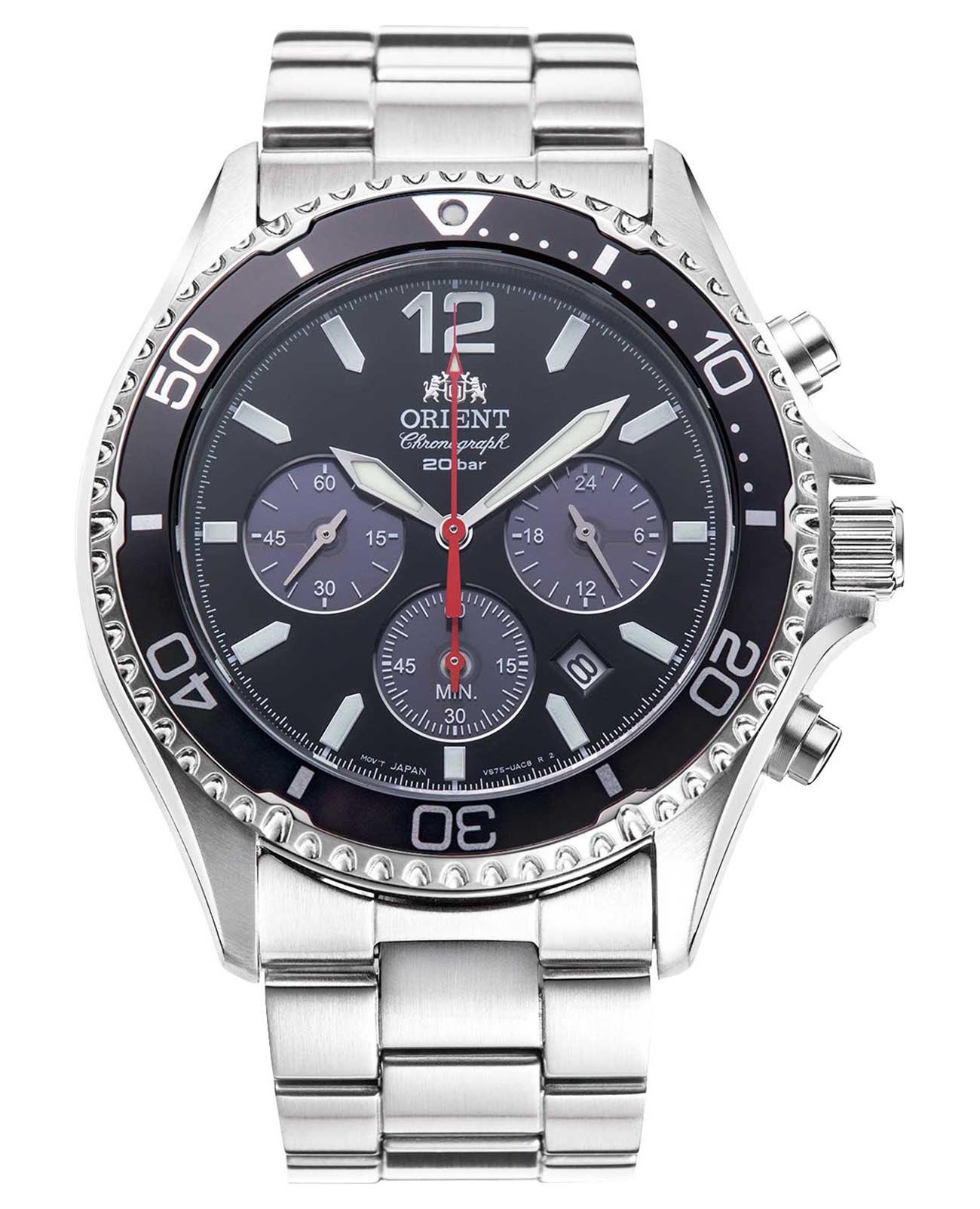 Мужские японские часы-хронограф Orient Automatic RA-TX0202B. Окошко даты находится между отметками 4 и 5 часов.Сапфировое стеклоСапфировое стеклоПрочный и надёжный материал из кристалла сапфира синтетического происхождения, характеризующийся особой твёрдостью и устойчивостью к царапинам и повреждениям.. Класс водозащиты: 200 метров, позволит плавать, нырять и заниматься другими водными видами спорта. Корпус часов изготовлен из стали. Рифленый вращающийся безельБезельВнешний ободок, закрепляющий стекло. В спортивных часах так называется поворотное кольцо с делениями на циферблате, выполняет роль таймера – замеряет отрезки времени на шкале. Неподвижный безель – элемент декора. Однонаправленно вращающийся безель на дайверских часах позволяет фиксировать моменты погружения и выныривания на поверхность. с IP-покрытиемIP-покрытиеМетод ионного напыления. Демонстрирует повышенную устойчивость к истиранию, окислению и химическим веществам. Под воздействием высокого давления и температуры около 1500°C молекулы металла надёжно соединяются с частицами корпуса часов. и с минутной шкалой. Браслет с раскладной застежкойРаскладная застёжкаТакой тип застёжки используется только на браслетах из металла. Она никогда не раскрывается полностью, происходит разделение на 2 и более частей. Раскладывающая застёжка снизит вероятность потери часов к минимуму. и системой блокировки. Метки и стрелки с люминесцентным покрытиемЛюминесцентное покрытиеПозволяет считывать показания времени в темноте. Производители наносят на стрелки, часовые индексы, безель или поверхность циферблата светонакопительный состав, дающий холодное свечение..