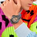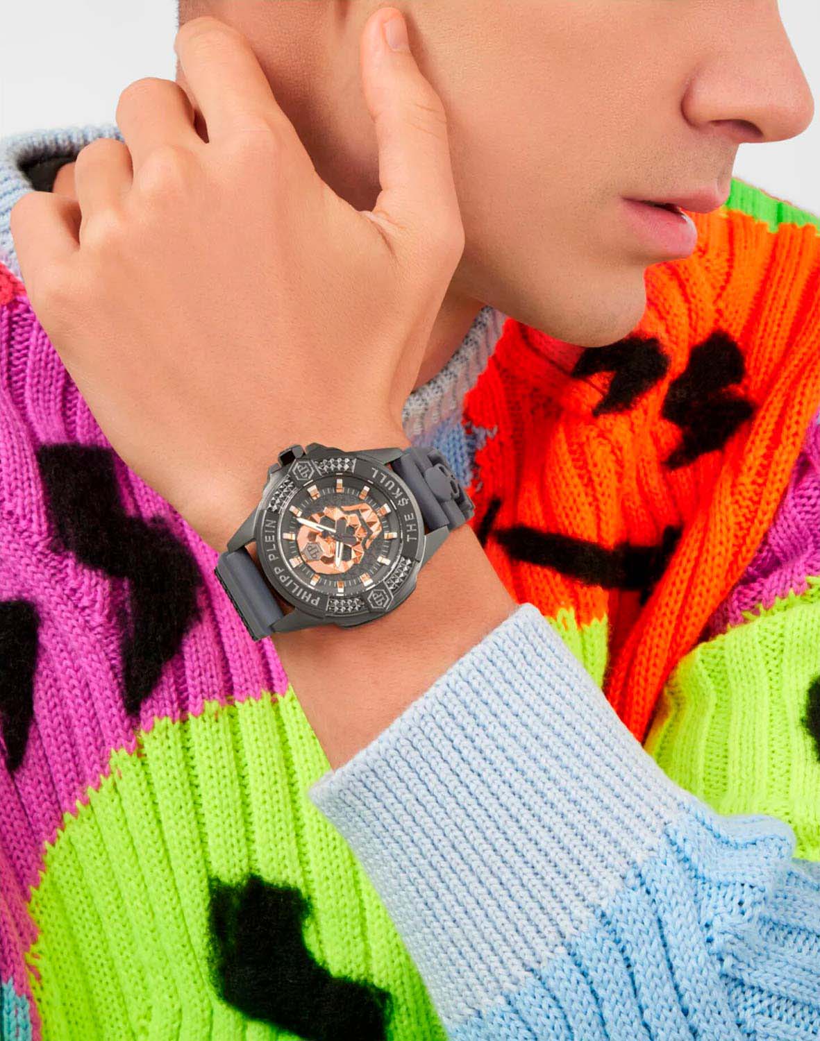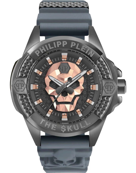 Эти необычные часы, воплощающие в себе уникальное сочетание узнаваемости бренда и непредсказуемости, каждый день будут напоминать вам о том, что нет таких целей, которых вы не смогли бы достичь. Мужские часы с японским кварцевым механизмом. Круглый стальной корпус с серым IP-покрытиемIP-покрытиеМетод ионного напыления. Демонстрирует повышенную устойчивость к истиранию, окислению и химическим веществам. Под воздействием высокого давления и температуры около 1500°C молекулы металла надёжно соединяются с частицами корпуса часов.. БезельБезельВнешний ободок, закрепляющий стекло. В спортивных часах так называется поворотное кольцо с делениями на циферблате, выполняет роль таймера – замеряет отрезки времени на шкале. Неподвижный безель – элемент декора. Однонаправленно вращающийся безель на дайверских часах позволяет фиксировать моменты погружения и выныривания на поверхность. украшен шестиугольными логотипами бренда, расположенными симметрично слева и справа, сверху украшен символичным логотипом Philipp Plein, а снизу украшен названием коллекции ''The Skull''. Гильошированный серый циферблат декорирован шестиугольным логотипом бренда в положении 12 часов и объемным черепом в цвете розовое золото. Метки в виде штрихов. Высокопрочное минеральное стеклоМинеральное стеклоМинеральное стекло представляет собой искусственно выращенный минерал кварца. Такое стекло отличается особой устойчивостью к повреждениям и царапинам. Уступает по некоторым качествам сапфировому стеклу.. Граненая заводная головка с защитой. Серый силиконовый ремешок с классической застежкой украшен объемным черепом и стальной вставкой. Фирменная дизайнерская упаковка.