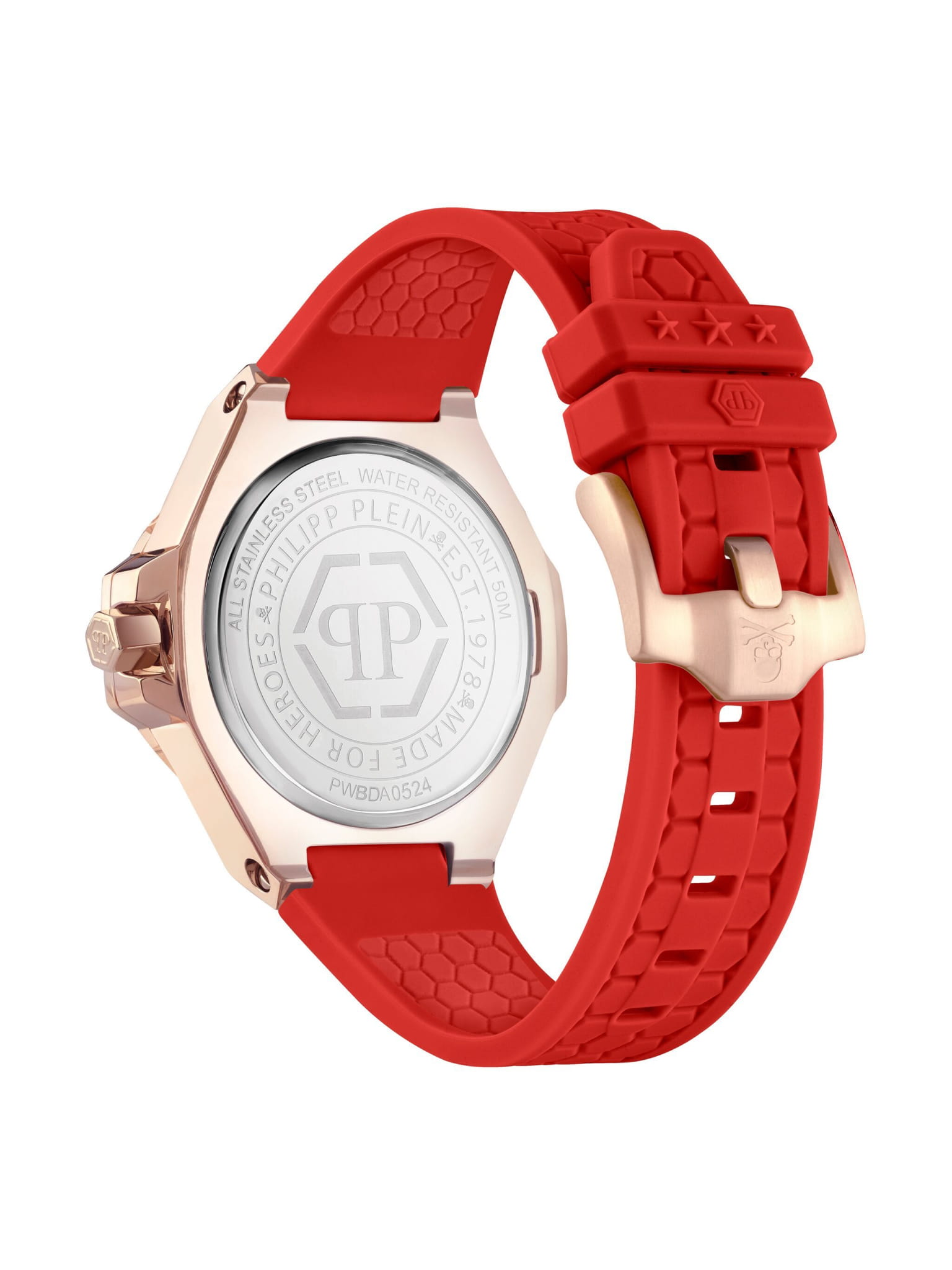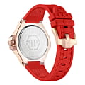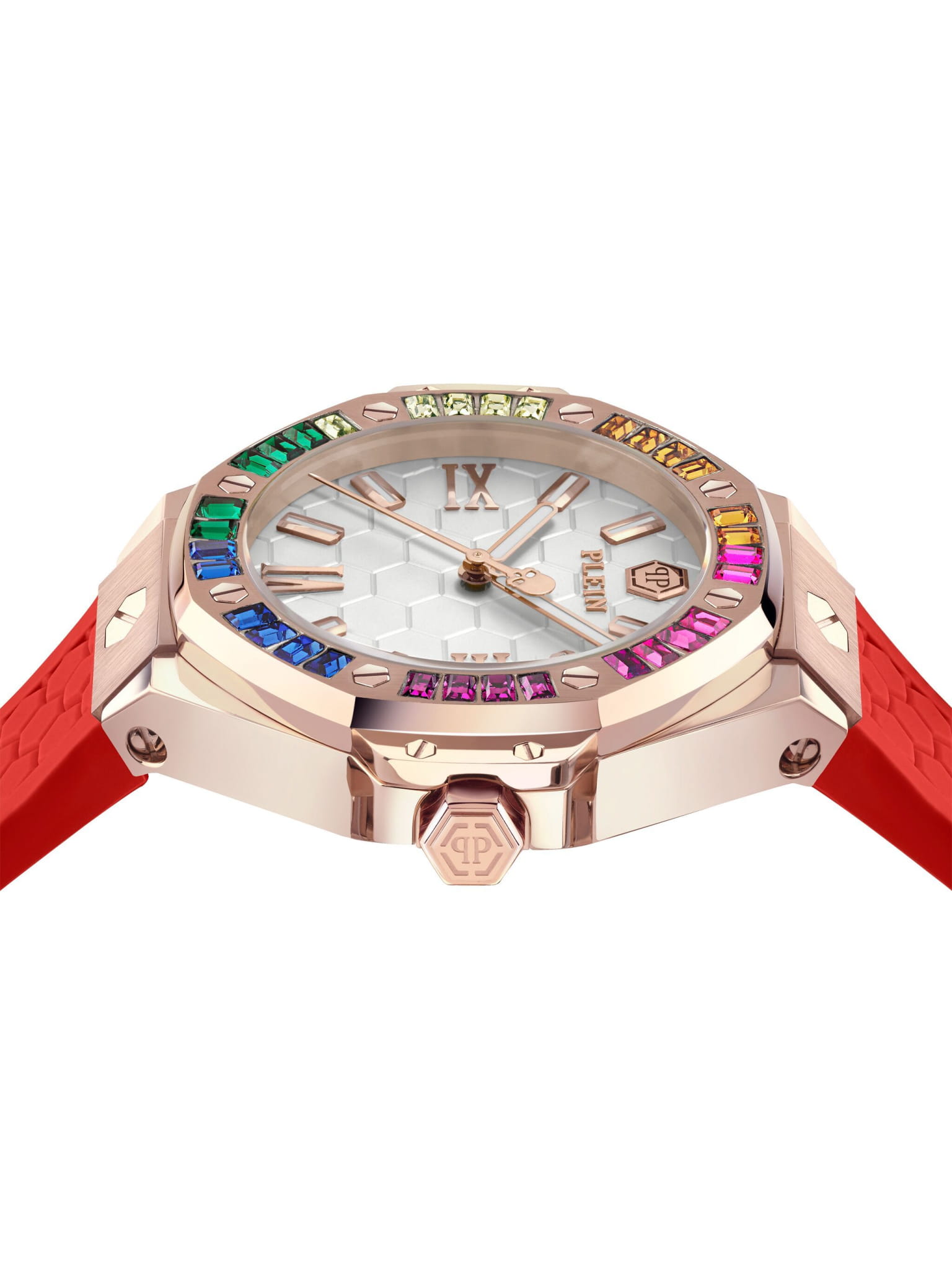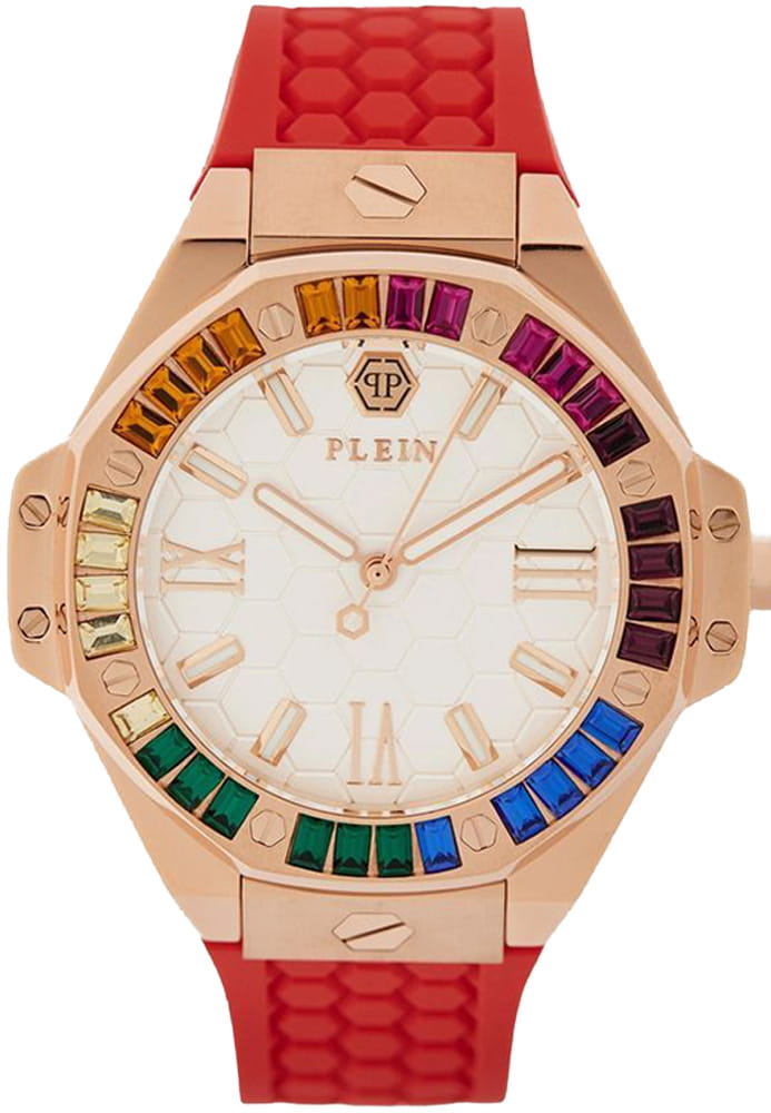 Philipp Plein Plein Lady Royal PWBDA0524 — стильные женские часы, сочетающие элегантный дизайн и функциональность. Корпус диаметром 39 мм выполнен из нержавеющей стали с розовым PVD-покрытиемPVDУльтратонкое покрытие наносится в технике вакуумного напыления, сочетает в себе нитрид титана особой прочности со слоем золота или оксида хрома. Несёт в себе декоративную или защитную функцию., что придаёт часам роскошный вид. Минеральное стеклоМинеральное стеклоМинеральное стекло представляет собой искусственно выращенный минерал кварца. Такое стекло отличается особой устойчивостью к повреждениям и царапинам. Уступает по некоторым качествам сапфировому стеклу. защищает циферблат от царапин, сохраняя его безупречный внешний вид. Циферблат инкрустирован кристаллами. Серебристый циферблат с шестиугольной текстурой подчёркивает фирменный стиль бренда. Часы оснащены кварцевым механизмом, который гарантирует точность хода. Водозащита до 5 ATM (50 метров) делает часы подходящими для повседневного использования. Ремешок из красного силикона обеспечивает комфортное ношение и надёжную фиксацию благодаря классической застёжке. Ширина ремешка 16 мм гармонично дополняет корпус, завершая стильный и современный образ.