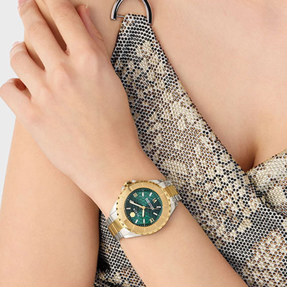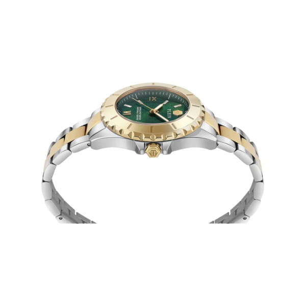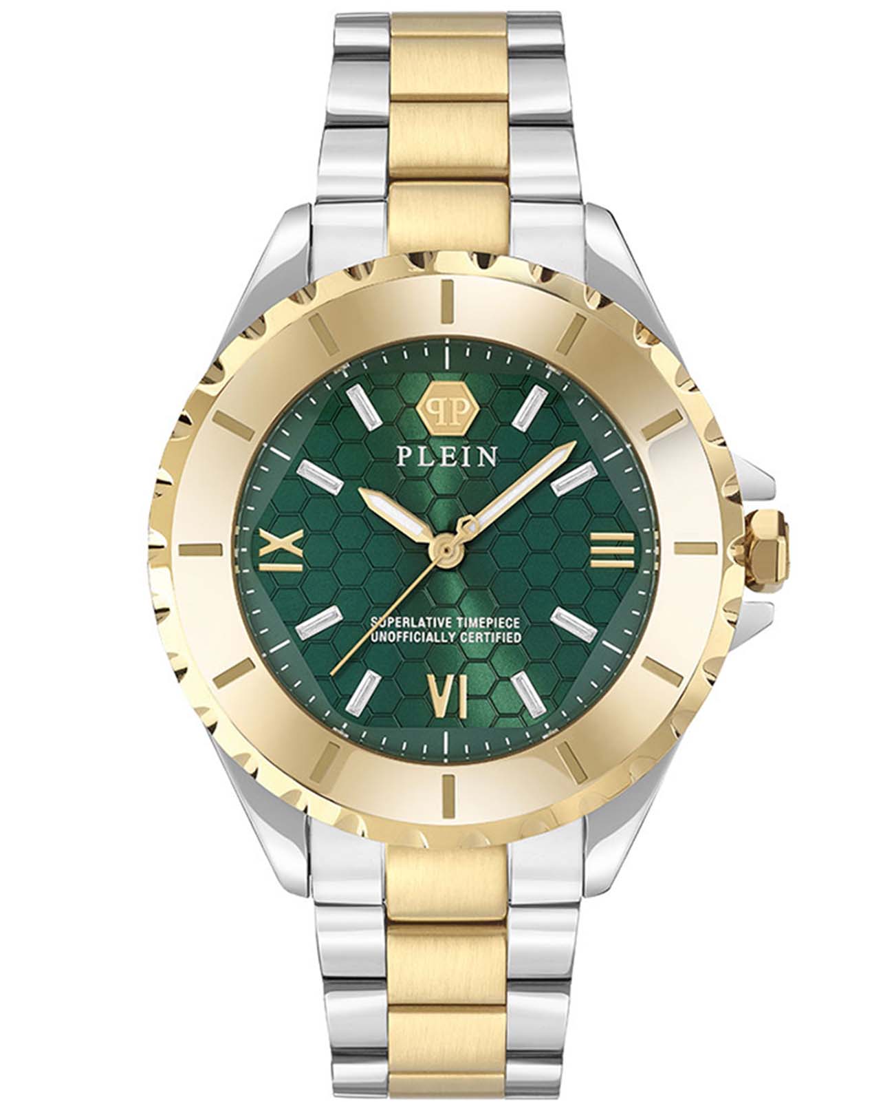 Часы Philipp Plein PWPOA0724 из коллекции Heaven сочетают элегантность и функциональность. Корпус диаметром 38 мм выполнен из нержавеющей стали, придающим изделию роскошный вид. Зеленый циферблат украшен фирменным логотипом бренда. Часы оснащены кварцевым механизмом, обеспечивающим точность хода. Минеральное стеклоМинеральное стеклоМинеральное стекло представляет собой искусственно выращенный минерал кварца. Такое стекло отличается особой устойчивостью к повреждениям и царапинам. Уступает по некоторым качествам сапфировому стеклу. защищает циферблат от повреждений, а люминесцентное покрытиеЛюминесцентное покрытиеПозволяет считывать показания времени в темноте. Производители наносят на стрелки, часовые индексы, безель или поверхность циферблата светонакопительный состав, дающий холодное свечение. на стрелках обеспечивают удобное считывание времени в условиях недостаточной освещённости. Водозащита 50WR позволяет использовать часы в повседневной жизни, включая случайные контакты с водой. Стальной браслет на застёжке-бабочке с кнопкамиЗастёжка "бабочка"Такой вид застёжки дополняется предохранителями, помогающими избежать случайного раскрытия браслета. Обладают изящным исполнением. с частичным IP-покрытиемIP-покрытиеМетод ионного напыления. Демонстрирует повышенную устойчивость к истиранию, окислению и химическим веществам. Под воздействием высокого давления и температуры около 1500°C молекулы металла надёжно соединяются с частицами корпуса часов.. Эти часы идеально подойдут для тех, кто ценит стиль и функциональность в одном аксессуаре. БезельБезельВнешний ободок, закрепляющий стекло. В спортивных часах так называется поворотное кольцо с делениями на циферблате, выполняет роль таймера – замеряет отрезки времени на шкале. Неподвижный безель – элемент декора. Однонаправленно вращающийся безель на дайверских часах позволяет фиксировать моменты погружения и выныривания на поверхность. с IP-покрытиемIP-покрытиеМетод ионного напыления. Демонстрирует повышенную устойчивость к истиранию, окислению и химическим веществам. Под воздействием высокого давления и температуры около 1500°C молекулы металла надёжно соединяются с частицами корпуса часов..