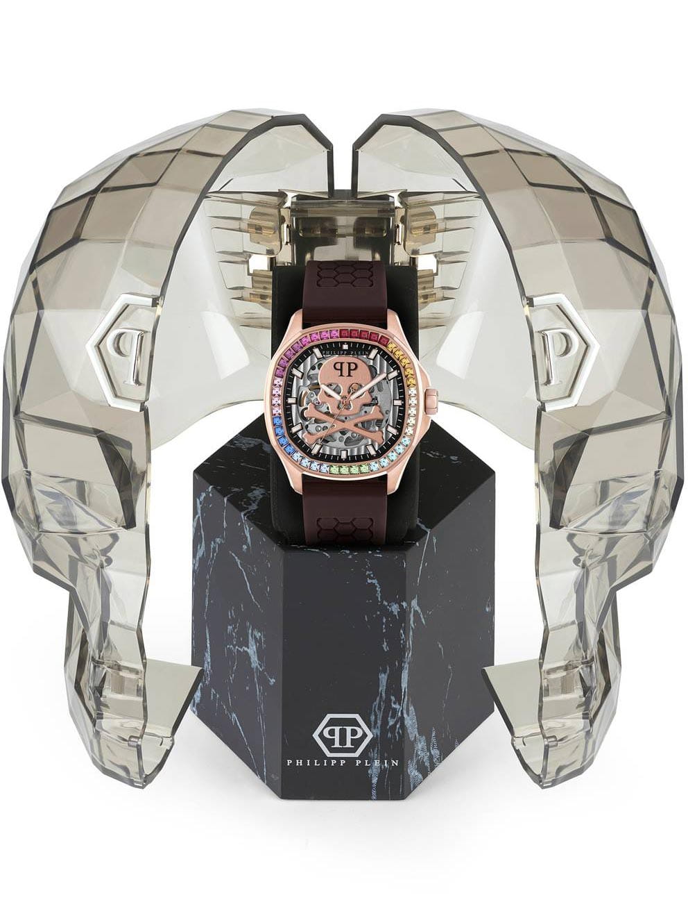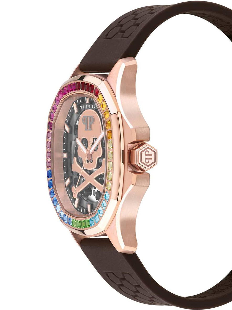 Яркие мужские часы с минеральным стекломМинеральное стеклоМинеральное стекло представляет собой искусственно выращенный минерал кварца. Такое стекло отличается особой устойчивостью к повреждениям и царапинам. Уступает по некоторым качествам сапфировому стеклу. Philipp Plein PWRAA0623, механический механизм.  Класс водозащиты: 50 метров, позволит защитить корпус от случайных брызг или капель дождя. Корпус часов изготовлен из стали и украшен кристаллами. Стрелки и метки с люминесцентным покрытиемЛюминесцентное покрытиеПозволяет считывать показания времени в темноте. Производители наносят на стрелки, часовые индексы, безель или поверхность циферблата светонакопительный состав, дающий холодное свечение.. Скелетонизированные. Часы с механизмом, из которого удалён весь «лишний» металл, с прозрачными циферблатом и задней крышкой,