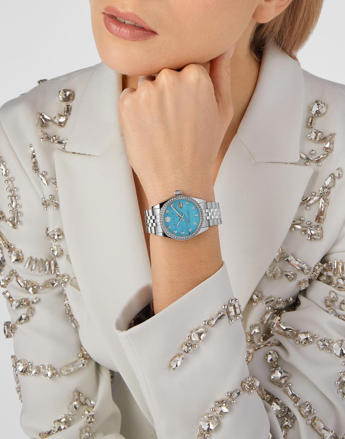 Яркие женские часы Philipp Plein Date Superlative PWYAA0423 c с минеральным стекломМинеральное стеклоМинеральное стекло представляет собой искусственно выращенный минерал кварца. Такое стекло отличается особой устойчивостью к повреждениям и царапинам. Уступает по некоторым качествам сапфировому стеклу.. Особенные часы для особенных женщин! Ослепительный аксессуар, демонстрирующий роскошь и изысканность.Часы с круглым стальным корпусом. Перламутровый циферблат с метками в виде точек, украшенных кристаллами. Люминесцентное покрытиеЛюминесцентное покрытиеПозволяет считывать показания времени в темноте. Производители наносят на стрелки, часовые индексы, безель или поверхность циферблата светонакопительный состав, дающий холодное свечение. стрелок. Окошко даты с увеличительным стеклом находится в положении 3 часа. Рифленая заводная головка. Стальной браслет на застёжке бабочка с кнопкамиЗастёжка "бабочка"Такой вид застёжки дополняется предохранителями, помогающими избежать случайного раскрытия браслета. Обладают изящным исполнением.
