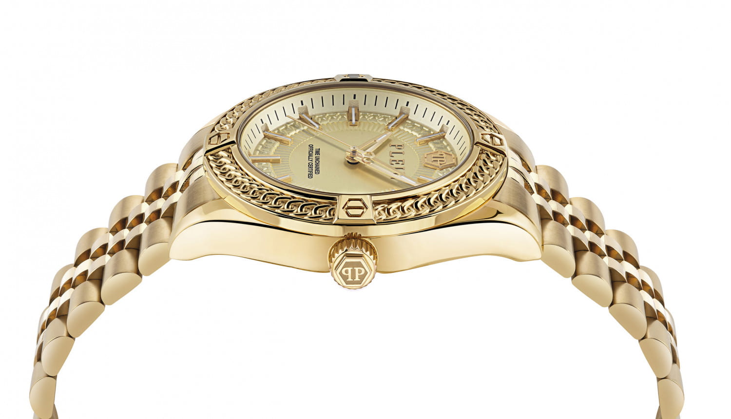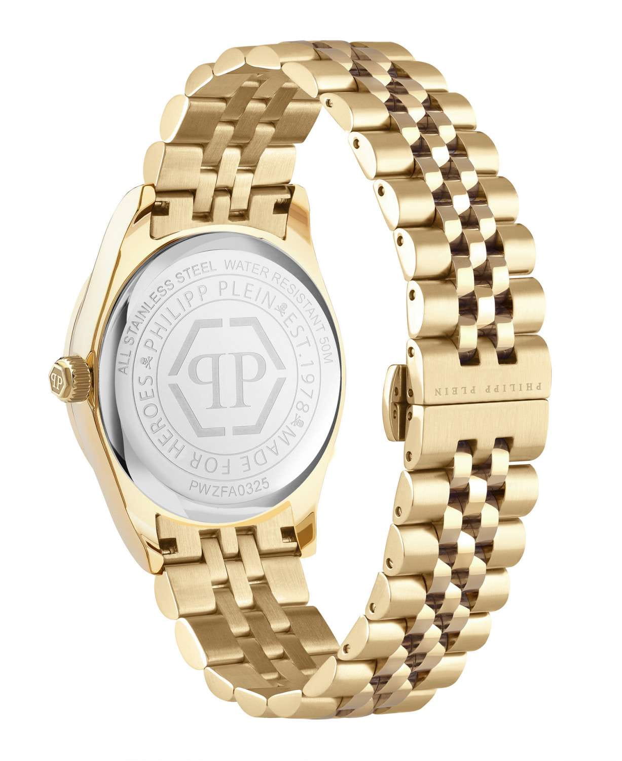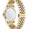 Philipp Plein Plein Icon Chain PWZFA0325 - часы в современном дизайне несомненно добавят вам выразительности и станут главным акцентом вашего стильного образа. Мужские кварцевые часы с высокой точностью. Круглый стальной корпус с PVD-покрытиемPVDУльтратонкое покрытие наносится в технике вакуумного напыления, сочетает в себе нитрид титана особой прочности со слоем золота или оксида хрома. Несёт в себе декоративную или защитную функцию. золотистого цвета, диаметром 43 мм. Циферблат декорирован логотипом бренда в положении 12 часов, метки в виде штрихов. Минеральное стеклоМинеральное стеклоМинеральное стекло представляет собой искусственно выращенный минерал кварца. Такое стекло отличается особой устойчивостью к повреждениям и царапинам. Уступает по некоторым качествам сапфировому стеклу. защищает циферблат от царапин. Люминесцентное покрытиеЛюминесцентное покрытиеПозволяет считывать показания времени в темноте. Производители наносят на стрелки, часовые индексы, безель или поверхность циферблата светонакопительный состав, дающий холодное свечение. стрелок позволит следить за временем даже в полной темноте. Стальной браслет с PVD-покрытиемPVDУльтратонкое покрытие наносится в технике вакуумного напыления, сочетает в себе нитрид титана особой прочности со слоем золота или оксида хрома. Несёт в себе декоративную или защитную функцию. на застёжке-бабочке с кнопкамиЗастёжка "бабочка"Такой вид застёжки дополняется предохранителями, помогающими избежать случайного раскрытия браслета. Обладают изящным исполнением. , обеспечивает комфортное ношение. Граненая заводная головка. Влагозащита: 50 метров, позволит защитить корпус от случайных брызг или капель дождя. Идеальный аксессуар для тех, кто ценит индивидуальность и не боится выделяться из толпы.