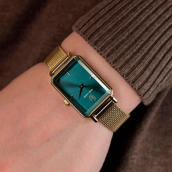 Женские кварцевые часы Pierre Lannier — это элегантный аксессуар с французским дизайном. Корпус прямоугольной формы размером 21 мм и толщиной 7,8 мм выполнен из нержавеющей стали с IP-покрытиемIP-покрытиеМетод ионного напыления. Демонстрирует повышенную устойчивость к истиранию, окислению и химическим веществам. Под воздействием высокого давления и температуры около 1500°C молекулы металла надёжно соединяются с частицами корпуса часов. цвета жёлтого золота. Циферблат зелёного цвета оформлен стрелками. Циферблат защищён минеральным стекломМинеральное стеклоМинеральное стекло представляет собой искусственно выращенный минерал кварца. Такое стекло отличается особой устойчивостью к повреждениям и царапинам. Уступает по некоторым качествам сапфировому стеклу., устойчивым к мелким механическим повреждениям. Часы оснащены стальным браслетом миланского плетения с IP-покрытиемIP-покрытиеМетод ионного напыления. Демонстрирует повышенную устойчивость к истиранию, окислению и химическим веществам. Под воздействием высокого давления и температуры около 1500°C молекулы металла надёжно соединяются с частицами корпуса часов. на раскладной застёжкеРаскладная застёжкаТакой тип застёжки используется только на браслетах из металла. Она никогда не раскрывается полностью, происходит разделение на 2 и более частей. Раскладывающая застёжка снизит вероятность потери часов к минимуму.. В комплект входит дополнительный кожаный ремешок. Водонепроницаемость 30 м позволяет использовать часы в повседневных условиях. Идеальный выбор для тех, кто ценит французский стиль и универсальный дизайн.