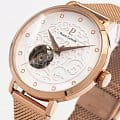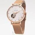 Женские механические часы с автоподзаводом Pierre Lannier Eolia 310F908. Минеральное стеклоМинеральное стеклоМинеральное стекло представляет собой искусственно выращенный минерал кварца. Такое стекло отличается особой устойчивостью к повреждениям и царапинам. Уступает по некоторым качествам сапфировому стеклу. устойчивое к мелким механическим повреждениям. Центральные часовая, минутная и секундная стрелки. Белый циферблат с открытым балансом хода украшен кристаллами Swarovski в местах часовых меток. Корпус и браслет выполнен из нержавеющей стали с IP-покрытиемIP-покрытиеМетод ионного напыления. Демонстрирует повышенную устойчивость к истиранию, окислению и химическим веществам. Под воздействием высокого давления и температуры около 1500°C молекулы металла надёжно соединяются с частицами корпуса часов.. Водостойкость: 50 метров, позволит защитить корпус от случайных брызг или капель дождя. Прозрачная задняя крышка. Браслет миланского плетения с раскладной застёжкойРаскладная застёжкаТакой тип застёжки используется только на браслетах из металла. Она никогда не раскрывается полностью, происходит разделение на 2 и более частей. Раскладывающая застёжка снизит вероятность потери часов к минимуму..