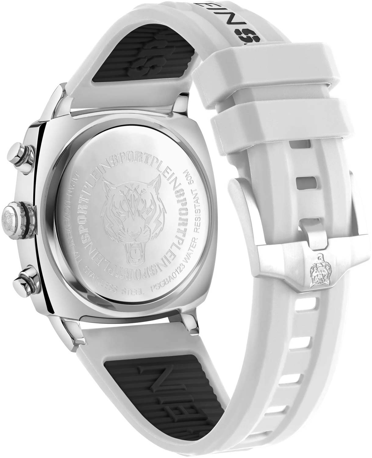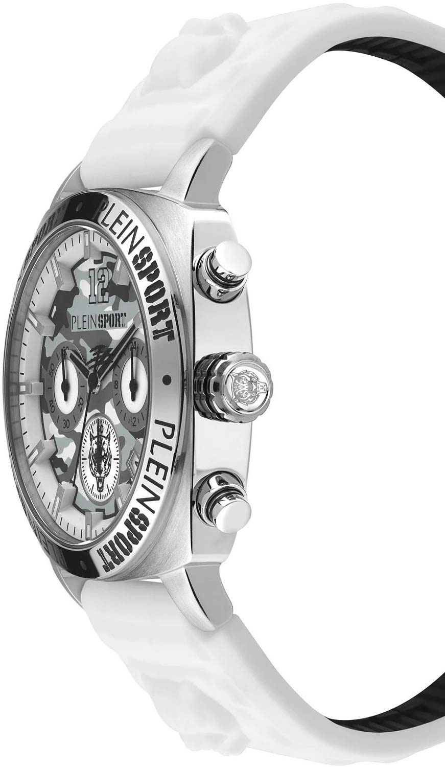 Немецкие мужские кварцевые часы-хронографХронографФункция позволяет измерять отрезки времени с особой точностью: часы, минуты, секунды. Верным признаком хронографа является наличие на циферблате 3 дополнительных окошек-счётчиков. с секундомеромСекундомерСекундоме́р — прибор, способный измерять интервалы времени с точностью до долей секунды. Plein Sport Wildcat PSGBA0123, кварцевый механизм с высокой точностью. Класс водозащиты: 50 метров, позволит защитить корпус от случайных брызг или капель дождя. Корпус часов изготовлен из стали. Стрелки и метки с люминесцентным покрытиемЛюминесцентное покрытиеПозволяет считывать показания времени в темноте. Производители наносят на стрелки, часовые индексы, безель или поверхность циферблата светонакопительный состав, дающий холодное свечение.. Силиконовый ремешок на стандартной застёжке. БезельБезельВнешний ободок, закрепляющий стекло. В спортивных часах так называется поворотное кольцо с делениями на циферблате, выполняет роль таймера – замеряет отрезки времени на шкале. Неподвижный безель – элемент декора. Однонаправленно вращающийся безель на дайверских часах позволяет фиксировать моменты погружения и выныривания на поверхность. с IP-покрытиемIP-покрытиеМетод ионного напыления. Демонстрирует повышенную устойчивость к истиранию, окислению и химическим веществам. Под воздействием высокого давления и температуры около 1500°C молекулы металла надёжно соединяются с частицами корпуса часов.. Окошко даты находится в положении между 4 и 5 часов.