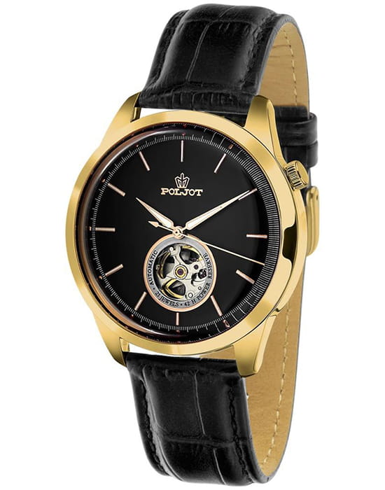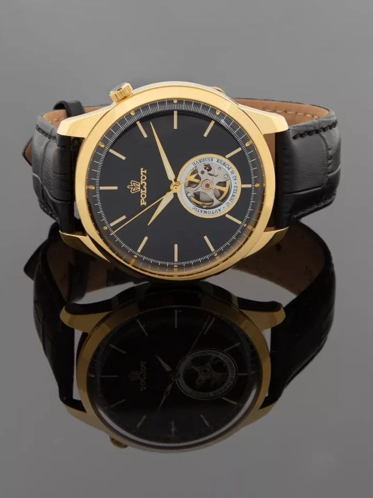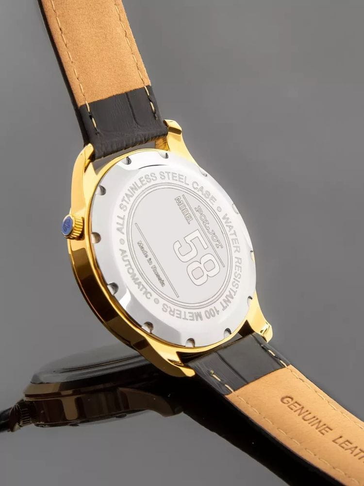 Poljot 82S0.586022 — изысканные механические мужские часы с автоподзаводом, в которых классика сочетается с технической эстетикой. Корпус из нержавеющей стали с PVD-покрытиемPVDУльтратонкое покрытие наносится в технике вакуумного напыления, сочетает в себе нитрид титана особой прочности со слоем золота или оксида хрома. Несёт в себе декоративную или защитную функцию. подчёркивает надёжность и строгость формы, а глубокий циферблат с изящным окном «open heart» демонстрирует работу механизма, придавая модели характер инженерной утончённости. Стрелки и метки с люминесцентным покрытиемЛюминесцентное покрытиеПозволяет считывать показания времени в темноте. Производители наносят на стрелки, часовые индексы, безель или поверхность циферблата светонакопительный состав, дающий холодное свечение.. Металлизированные стрелки и метки создают аккуратный контраст и обеспечивают превосходную читаемость, а прочное минеральное стеклоМинеральное стеклоМинеральное стекло представляет собой искусственно выращенный минерал кварца. Такое стекло отличается особой устойчивостью к повреждениям и царапинам. Уступает по некоторым качествам сапфировому стеклу. надёжно защищает циферблат от повреждений. Ремешок из натуральной кожи тёплого коричневого оттенка добавляет образу благородства и комфорта. Poljot — это часы для мужчин, ценящих механику, традиции и спокойную уверенность в каждой детали.