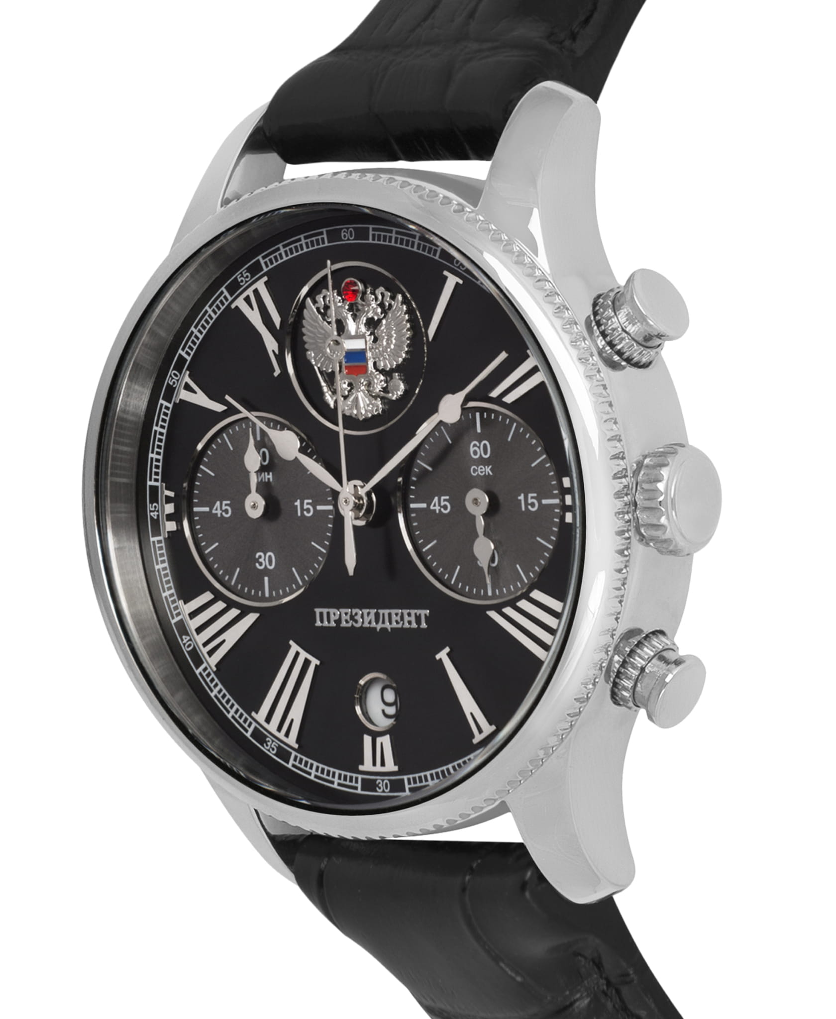 Часы «Президент» модели 3520414 — это мужские кварцевые наручные часы с хронографом, сочетающие классический дизайн и функциональность. Механизм: кварцевый хронограф Miyota 6S21, обеспечивающий точность и надёжность. Функции: часы, минуты, секунды, дата, хронограф (секундомер). Корпус: из нержавеющей стали, диаметр 41,8 мм, толщина 11,4 мм. Циферблат: чёрный с римскими цифрами и государственным гербом, подчёркивающий элегантность дизайна. Стекло: сапфировое стеклоСапфировое стеклоПрочный и надёжный материал из кристалла сапфира синтетического происхождения, характеризующийся особой твёрдостью и устойчивостью к царапинам и повреждениям. с антибликовым покрытием, устойчивое к царапинам. Водонепроницаемость: 5 ATM (50 метров), подходящая для повседневного использования. Ремешок: кожаный, шириной 20 мм, с классической застёжкой. Эти часы — отличный выбор для деловых людей, ценящих сочетание стиля и функциональности.