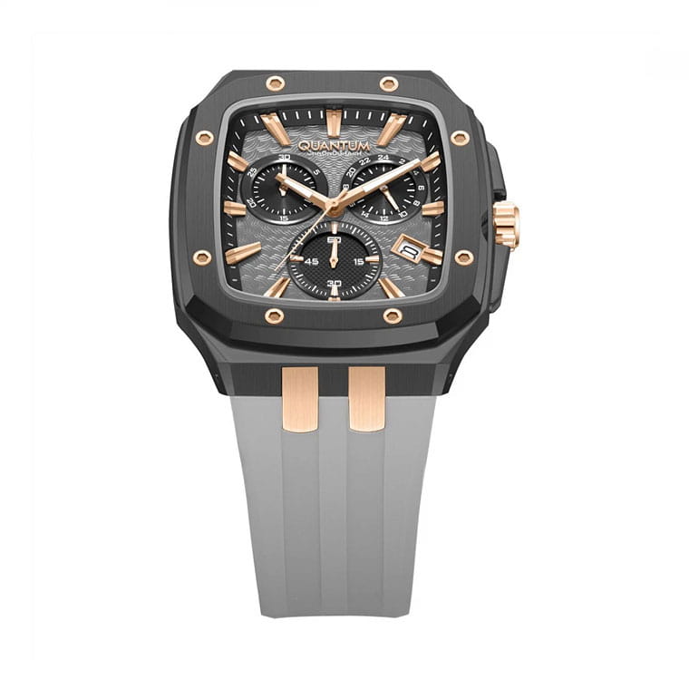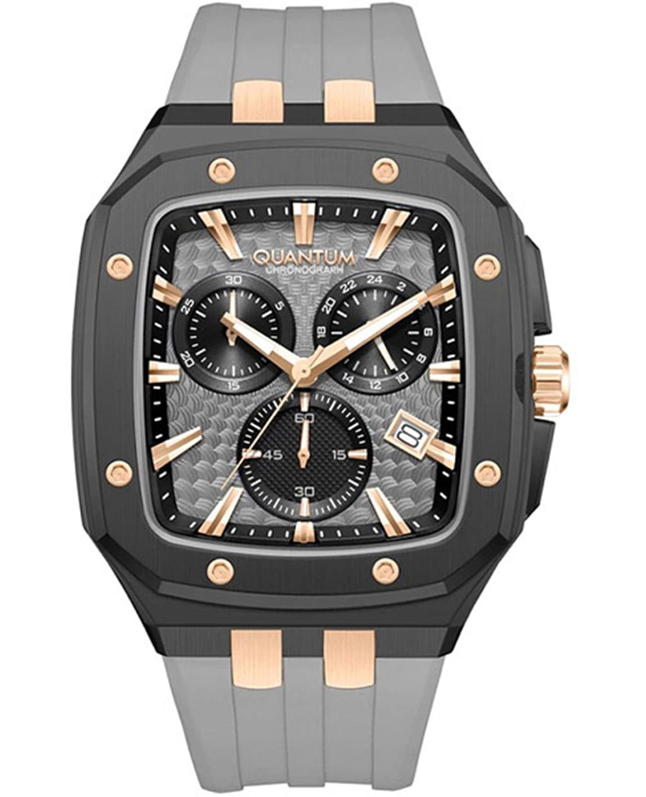 Мужские кварцевые часы Quantum из коллекции Hunter — стильный прямоугольный акцент с функциональным хронографом. Корпус прямоугольный, из нержавеющей стали с PVD-покрытиемPVDУльтратонкое покрытие наносится в технике вакуумного напыления, сочетает в себе нитрид титана особой прочности со слоем золота или оксида хрома. Несёт в себе декоративную или защитную функцию., размером 44 мм. Циферблат — серый с функциями хронографаХронографФункция позволяет измерять отрезки времени с особой точностью: часы, минуты, секунды. Верным признаком хронографа является наличие на циферблате 3 дополнительных окошек-счётчиков. и даты. Стекло — минеральноеМинеральное стеклоМинеральное стекло представляет собой искусственно выращенный минерал кварца. Такое стекло отличается особой устойчивостью к повреждениям и царапинам. Уступает по некоторым качествам сапфировому стеклу. с антибликовым покрытием. Механизм — японский кварцевый Seiko. Водонепроницаемость 100 м. Ремешок — серый силиконовый на стандартной застёжке. Идеальный выбор для тех, кто ценит турецкий дизайн и современный спортивный стиль.