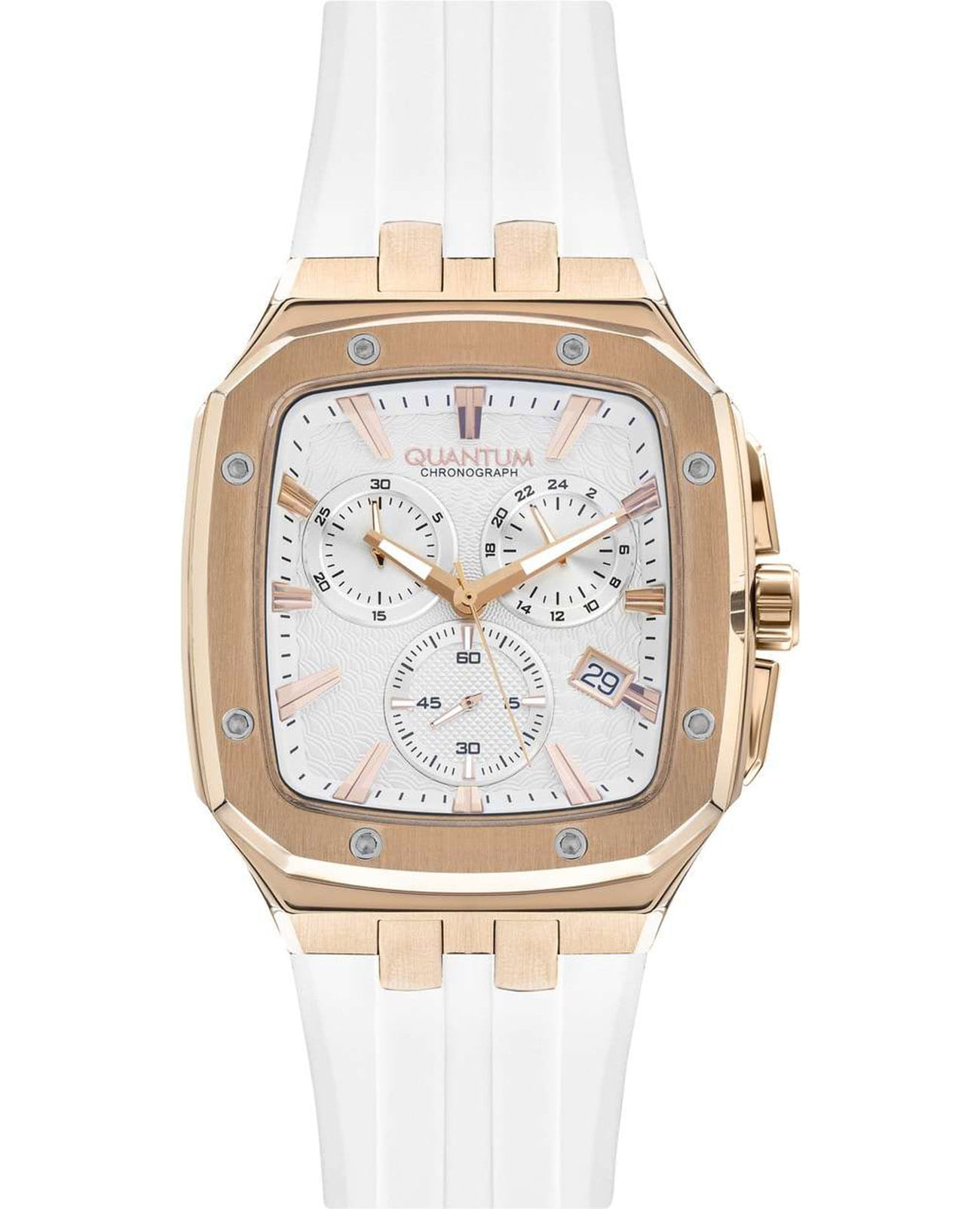 Мужские кварцевые часы Quantum из коллекции Hunter — яркий пример современного дизайна и продуманной функциональности. Прямоугольный корпус из нержавеющей стали с PVD-покрытиемPVDУльтратонкое покрытие наносится в технике вакуумного напыления, сочетает в себе нитрид титана особой прочности со слоем золота или оксида хрома. Несёт в себе декоративную или защитную функцию. цвета розового золота создаёт выразительный акцент, гармонично сочетающийся с лаконичным белым циферблатом. Часы оснащены хронографомХронографФункция позволяет измерять отрезки времени с особой точностью: часы, минуты, секунды. Верным признаком хронографа является наличие на циферблате 3 дополнительных окошек-счётчиков. и окошком даты, а минеральное стеклоМинеральное стеклоМинеральное стекло представляет собой искусственно выращенный минерал кварца. Такое стекло отличается особой устойчивостью к повреждениям и царапинам. Уступает по некоторым качествам сапфировому стеклу. с антибликовым покрытием обеспечивает чёткость восприятия в любых условиях. Стрелки с люминесцентным покрытиемЛюминесцентное покрытиеПозволяет считывать показания времени в темноте. Производители наносят на стрелки, часовые индексы, безель или поверхность циферблата светонакопительный состав, дающий холодное свечение.. Надёжный кварцевый механизм Seiko гарантирует точность хода, а водонепроницаемость 100 м делает модель подходящей для повседневного ношения и активного отдыха. Белый силиконовый ремешок на стандартной застёжке подчёркивает спортивный характер аксессуара, оставаясь при этом универсальным и удобным. Идеальный выбор для тех, кто ценит турецкий дизайн и современный стиль.