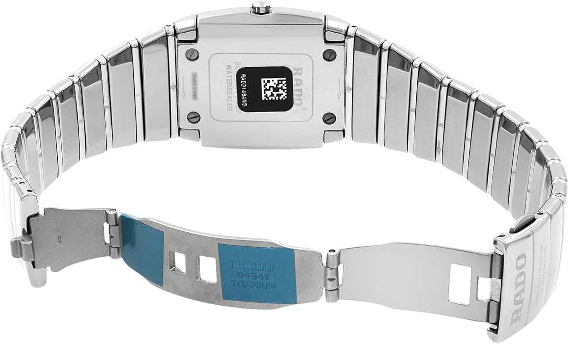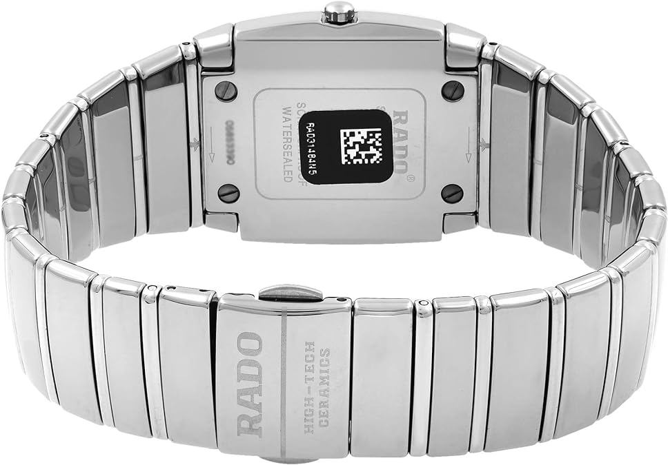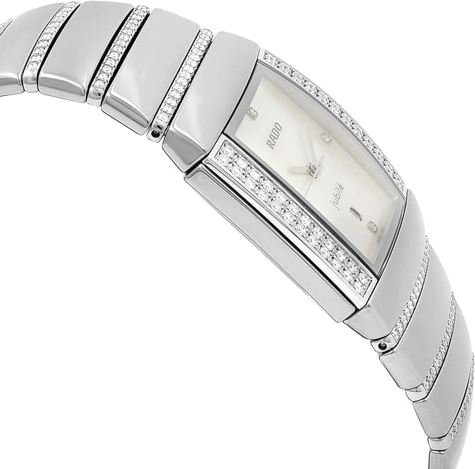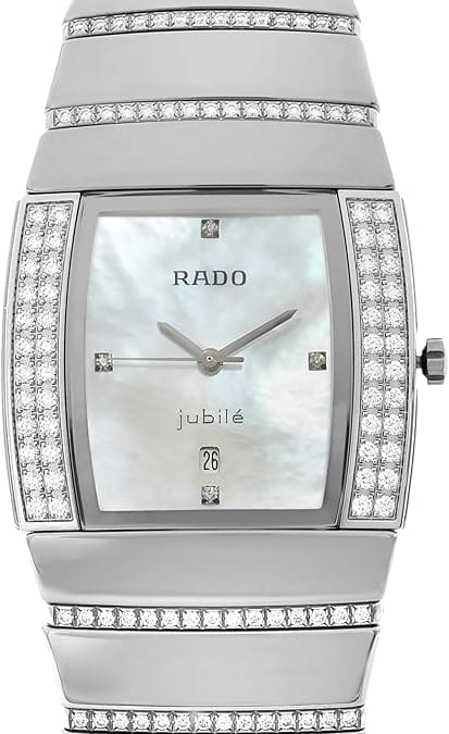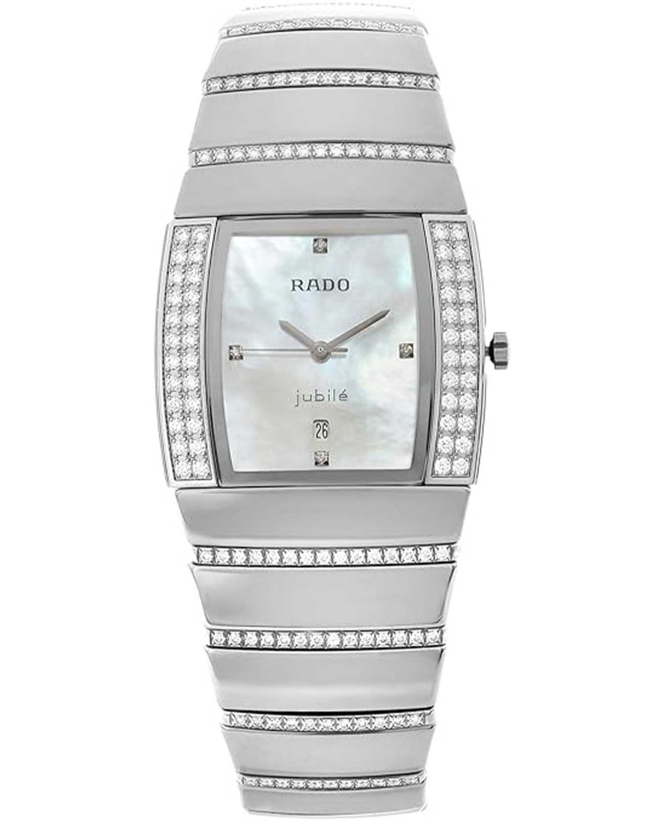 Часы Rado Sintra R13577909, произведение искусства и технологическое чудо, станут прекрасным дополнением к коллекции. Эти швейцарские часы оснащены кварцевым механизмом с указателем даты и тремя стрелками, заключенным в корпус из нержавеющей стали.  Браслет изготовлен из высокотехнологичной керамикиВысокотехнологичная керамикаИнновационный запатентованный Rado материал с гладкой или матовой поверхностью. Керамика за счёт кристаллической структуры обладает повышенной устойчивостью от возникновения царапин. Материал способен принимать температуру тела человека, обеспечивая невероятный комфорт при ношении. с раскладной застёжкойРаскладная застёжкаТакой тип застёжки используется только на браслетах из металла. Она никогда не раскрывается полностью, происходит разделение на 2 и более частей. Раскладывающая застёжка снизит вероятность потери часов к минимуму.. Корпус украшен 48 бриллиантами, циферблат 4 бриллианта, браслет 102 бриллианта. Сапфировое стеклоСапфировое стеклоПрочный и надёжный материал из кристалла сапфира синтетического происхождения, характеризующийся особой твёрдостью и устойчивостью к царапинам и повреждениям. устойчивое к появлению царапин, обладающее высокой прозрачностью. Класс водозащиты: 30 метров, позволит защитить корпус от случайных брызг или капель дождя.