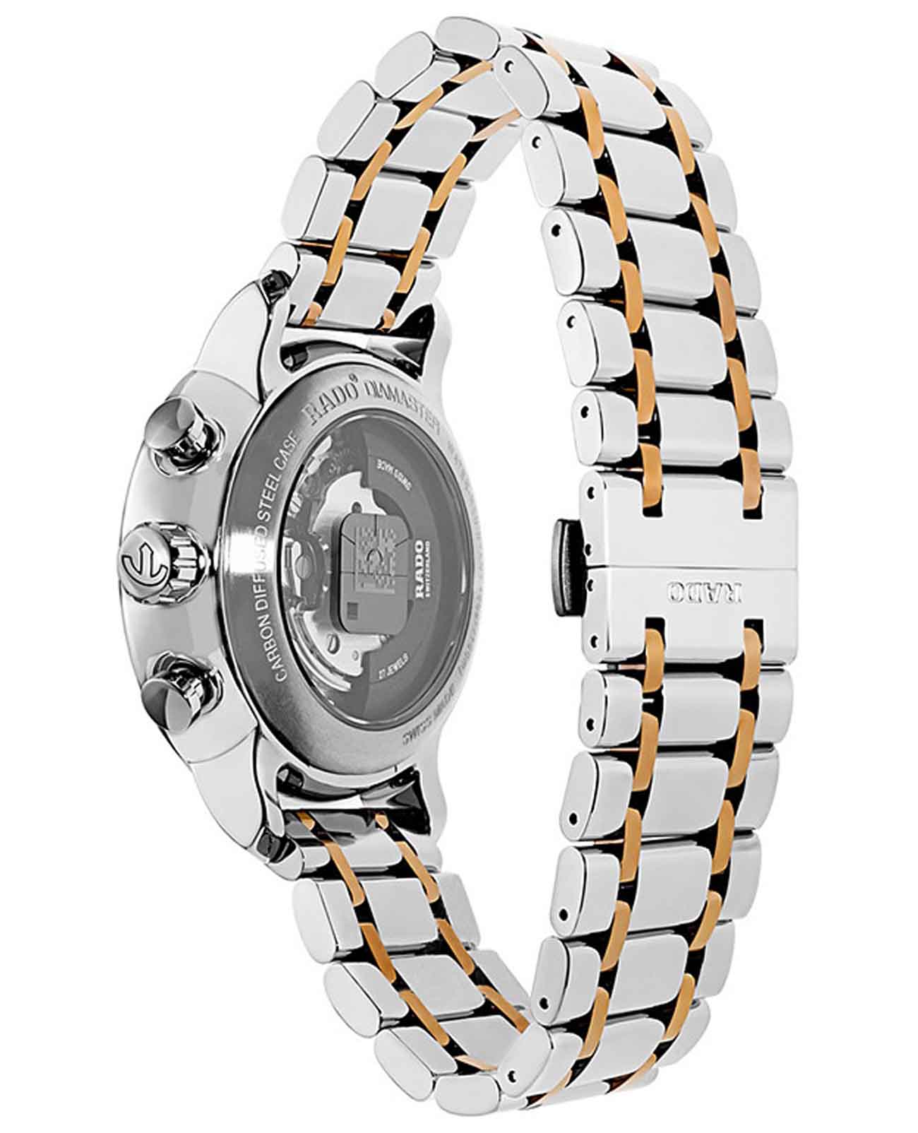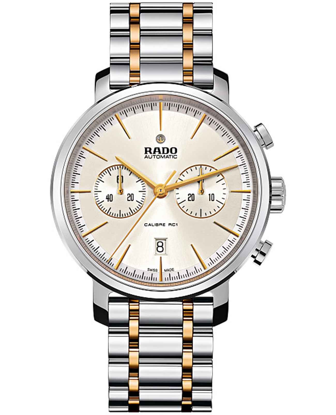 Мужские механические швейцарские часы-хронографХронографФункция позволяет измерять отрезки времени с особой точностью: часы, минуты, секунды. Верным признаком хронографа является наличие на циферблате 3 дополнительных окошек-счётчиков. с автоподзаводом Rado Diamaster R14070103. Сапфировое стеклоСапфировое стеклоПрочный и надёжный материал из кристалла сапфира синтетического происхождения, характеризующийся особой твёрдостью и устойчивостью к царапинам и повреждениям. устойчивое к мелким механическим повреждениям. Корпус часов изготовлен из углеродистой диффузной стали. Окошко даты находится в положении 6 часов. Класс водозащиты: 100 метров, позволит плавать, нырять и заниматься другими водными видами спорта. Браслет из нержавеющей стали с частичным PVD-покрытиемPVDУльтратонкое покрытие наносится в технике вакуумного напыления, сочетает в себе нитрид титана особой прочности со слоем золота или оксида хрома. Несёт в себе декоративную или защитную функцию. на застёжке «бабочка» с кнопкамиЗастёжка "бабочка"Такой вид застёжки дополняется предохранителями, помогающими избежать случайного раскрытия браслета. Обладают изящным исполнением. .