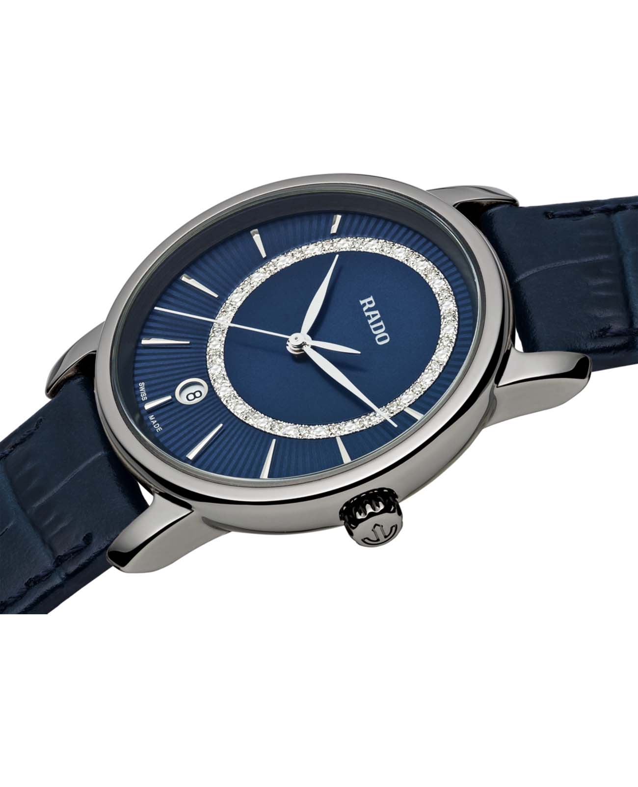 Мужские швейцарские часы Rado Diamaster R14078205, кварцевый механизм с высокой точностью. Сапфировое стеклоСапфировое стеклоПрочный и надёжный материал из кристалла сапфира синтетического происхождения, характеризующийся особой твёрдостью и устойчивостью к царапинам и повреждениям. устойчивое к мелким механическим повреждениям. Корпус часов изготовлен из нержавеющей стали. Окошко даты находится в положении 6 часов. Класс водозащиты: 50 метров, позволит защитить корпус от случайных брызг или капель дождя. Кожаный ремешок на раскладной застёжкеРаскладная застёжкаТакой тип застёжки используется только на браслетах из металла. Она никогда не раскрывается полностью, происходит разделение на 2 и более частей. Раскладывающая застёжка снизит вероятность потери часов к минимуму..