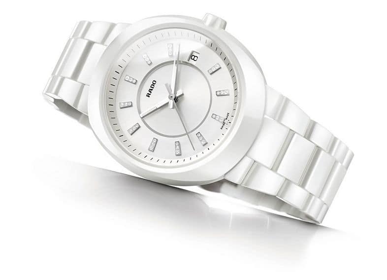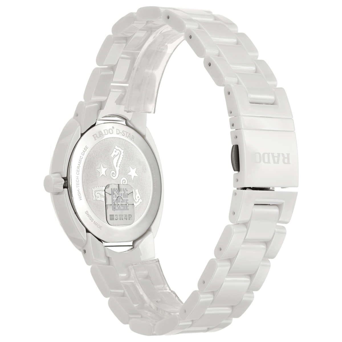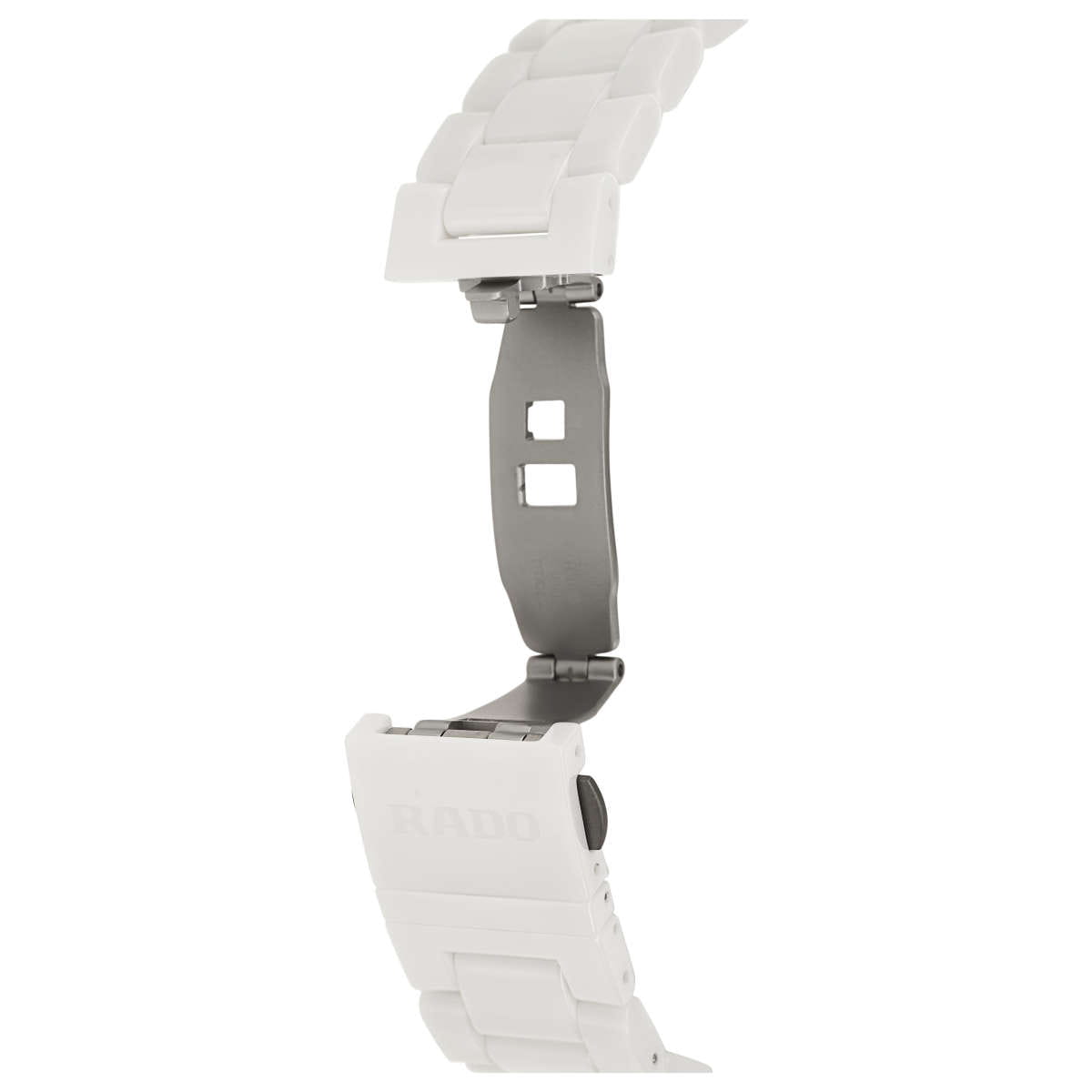 Женские швейцарские часы с надёжным кварцевым механизмом. Rado Hyperchrome R15519702. Сапфировое стеклоСапфировое стеклоПрочный и надёжный материал из кристалла сапфира синтетического происхождения, характеризующийся особой твёрдостью и устойчивостью к царапинам и повреждениям. устойчивое к мелким механическим повреждениям. Корпус и браслет часов изготовлены из Высокотехнологичная керамикаВысокотехнологичная керамикаИнновационный запатентованный Rado материал с гладкой или матовой поверхностью. Керамика за счёт кристаллической структуры обладает повышенной устойчивостью от возникновения царапин. Материал способен принимать температуру тела человека, обеспечивая невероятный комфорт при ношении.. Браслет на раскладной застёжкеРаскладная застёжкаТакой тип застёжки используется только на браслетах из металла. Она никогда не раскрывается полностью, происходит разделение на 2 и более частей. Раскладывающая застёжка снизит вероятность потери часов к минимуму.. Окошко даты находится в положении 3 часа. Стрелки и метки с люминесцентным покрытиемЛюминесцентное покрытиеПозволяет считывать показания времени в темноте. Производители наносят на стрелки, часовые индексы, безель или поверхность циферблата светонакопительный состав, дающий холодное свечение.. Класс водозащиты: 100 метров, позволит плавать, нырять и заниматься другими водными видами спорта.