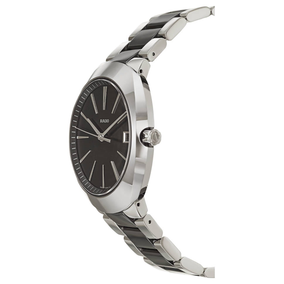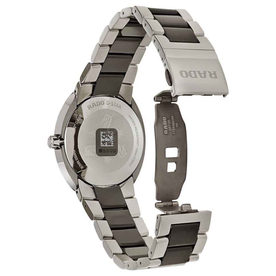 Мужские швейцарские часы Rado D-Star R15943162. Сапфировое стеклоСапфировое стеклоПрочный и надёжный материал из кристалла сапфира синтетического происхождения, характеризующийся особой твёрдостью и устойчивостью к царапинам и повреждениям. устойчивое к мелким механическим повреждениям. Корпус часов изготовлен из CeramosCeramosМатериал являет собой инновационное сочетание высокотехнологичной керамики и сплава металла. Он объединяет керамическую устойчивость к царапинам и металлический роскошный блеск. . Окошко даты находится в положении 3 часа. Класс водозащиты: 100 метров, позволит плавать, нырять и заниматься другими водными видами спорт. Браслет из нержавеющей стали со вставками из высокотехнологичной керамикиВысокотехнологичная керамикаИнновационный запатентованный Rado материал с гладкой или матовой поверхностью. Керамика за счёт кристаллической структуры обладает повышенной устойчивостью от возникновения царапин. Материал способен принимать температуру тела человека, обеспечивая невероятный комфорт при ношении. на раскладной застёжкеРаскладная застёжкаТакой тип застёжки используется только на браслетах из металла. Она никогда не раскрывается полностью, происходит разделение на 2 и более частей. Раскладывающая застёжка снизит вероятность потери часов к минимуму..