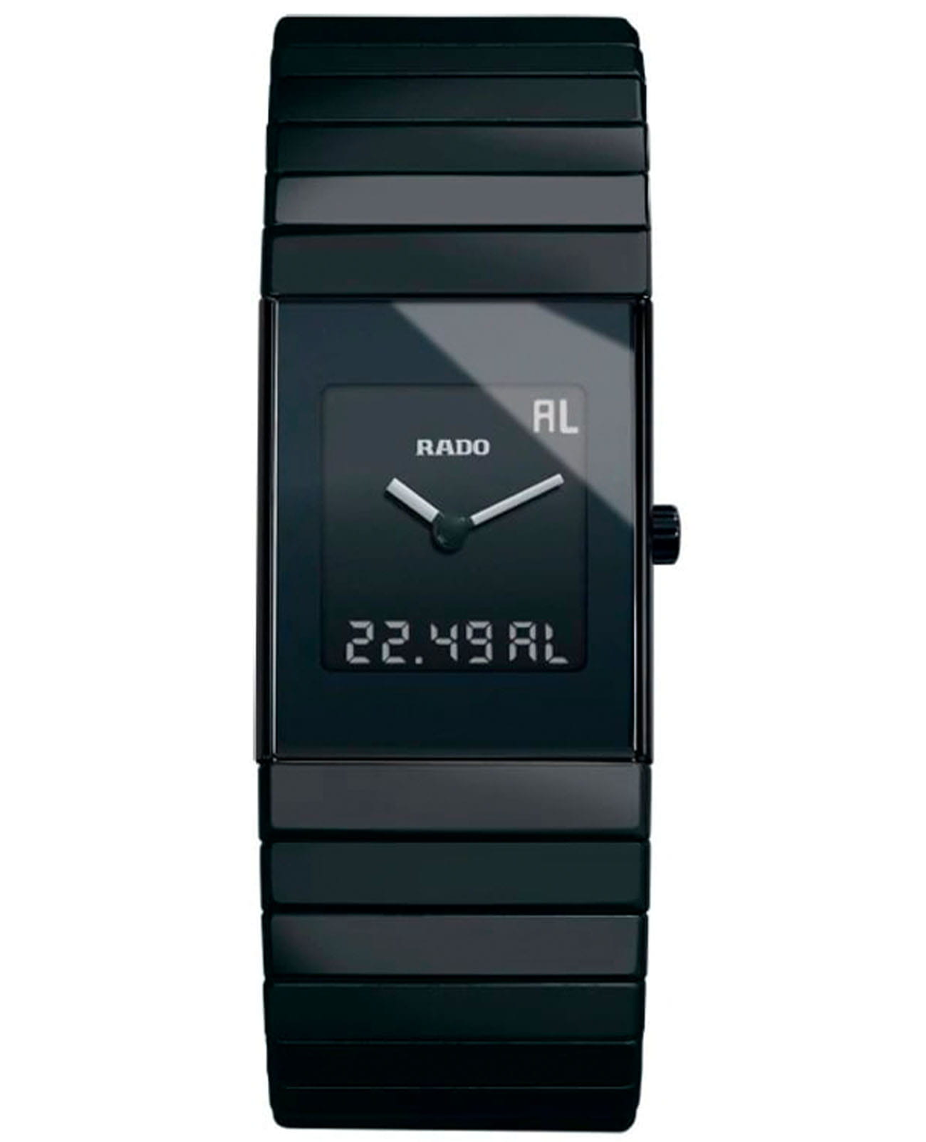Швейцарские мужские часы c хронографомХронографФункция позволяет измерять отрезки времени с особой точностью: часы, минуты, секунды. Верным признаком хронографа является наличие на циферблате 3 дополнительных окошек-счётчиков. и с будильникомБудильникБуди́льник — часы, в заданный момент времени подающие звуковой, световой и/или в редких случаях другой сигнал. Rado Sintra R21854152. Сапфировое стеклоСапфировое стеклоПрочный и надёжный материал из кристалла сапфира синтетического происхождения, характеризующийся особой твёрдостью и устойчивостью к царапинам и повреждениям. устойчивое к мелким механическим повреждениям. Корпус часов изготовлен из высокотехнологичной керамикиВысокотехнологичная плазменная керамикаИнновационный материал, технология запатентована. Выплавление керамики осуществляется в печи при 20 000 °C, белоснежный материал под воздействием ультравысокой температуры приобретает уникальный блеск, присущий металлам.. Стрелки с люминесцентным покрытиемЛюминесцентное покрытиеПозволяет считывать показания времени в темноте. Производители наносят на стрелки, часовые индексы, безель или поверхность циферблата светонакопительный состав, дающий холодное свечение.. Класс водозащиты: 30 метров, позволит защитить корпус от случайных брызг или капель дождя. Браслет из высокотехнологичной керамикиВысокотехнологичная керамикаИнновационный запатентованный Rado материал с гладкой или матовой поверхностью. Керамика за счёт кристаллической структуры обладает повышенной устойчивостью от возникновения царапин. Материал способен принимать температуру тела человека, обеспечивая невероятный комфорт при ношении. на раскладной застёжкеРаскладная застёжкаТакой тип застёжки используется только на браслетах из металла. Она никогда не раскрывается полностью, происходит разделение на 2 и более частей. Раскладывающая застёжка снизит вероятность потери часов к минимуму..