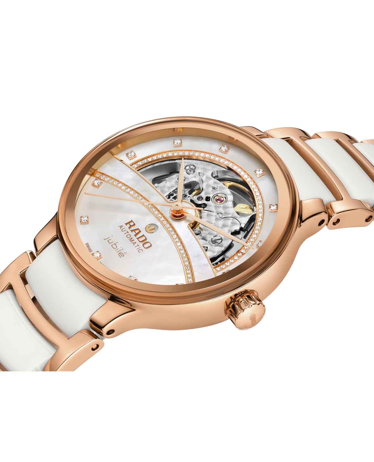 Женские механические швейцарские часы-скелетоны Rado Centrix Automatic Diamonds Open Heart R30029932 из коллекции Rado Centrix отражают собой часовое искусство в премиальном исполнении. Сапфировое стеклоСапфировое стеклоПрочный и надёжный материал из кристалла сапфира синтетического происхождения, характеризующийся особой твёрдостью и устойчивостью к царапинам и повреждениям. устойчивое к мелким механическим повреждениям. Корпус часов изготовлен из нержавеющей стали с PVD-покрытиемPVDУльтратонкое покрытие наносится в технике вакуумного напыления, сочетает в себе нитрид титана особой прочности со слоем золота или оксида хрома. Несёт в себе декоративную или защитную функцию.. Скелетонизированный циферблат инкрустирован бриллиантами. Класс водозащиты: 50 метров, позволит защитить корпус от случайных брызг или капель дождя. Браслет из стали и высокотехнологичной керамикиВысокотехнологичная керамикаИнновационный запатентованный Rado материал с гладкой или матовой поверхностью. Керамика за счёт кристаллической структуры обладает повышенной устойчивостью от возникновения царапин. Материал способен принимать температуру тела человека, обеспечивая невероятный комфорт при ношении. на раскладной застёжкеРаскладная застёжкаТакой тип застёжки используется только на браслетах из металла. Она никогда не раскрывается полностью, происходит разделение на 2 и более частей. Раскладывающая застёжка снизит вероятность потери часов к минимуму..