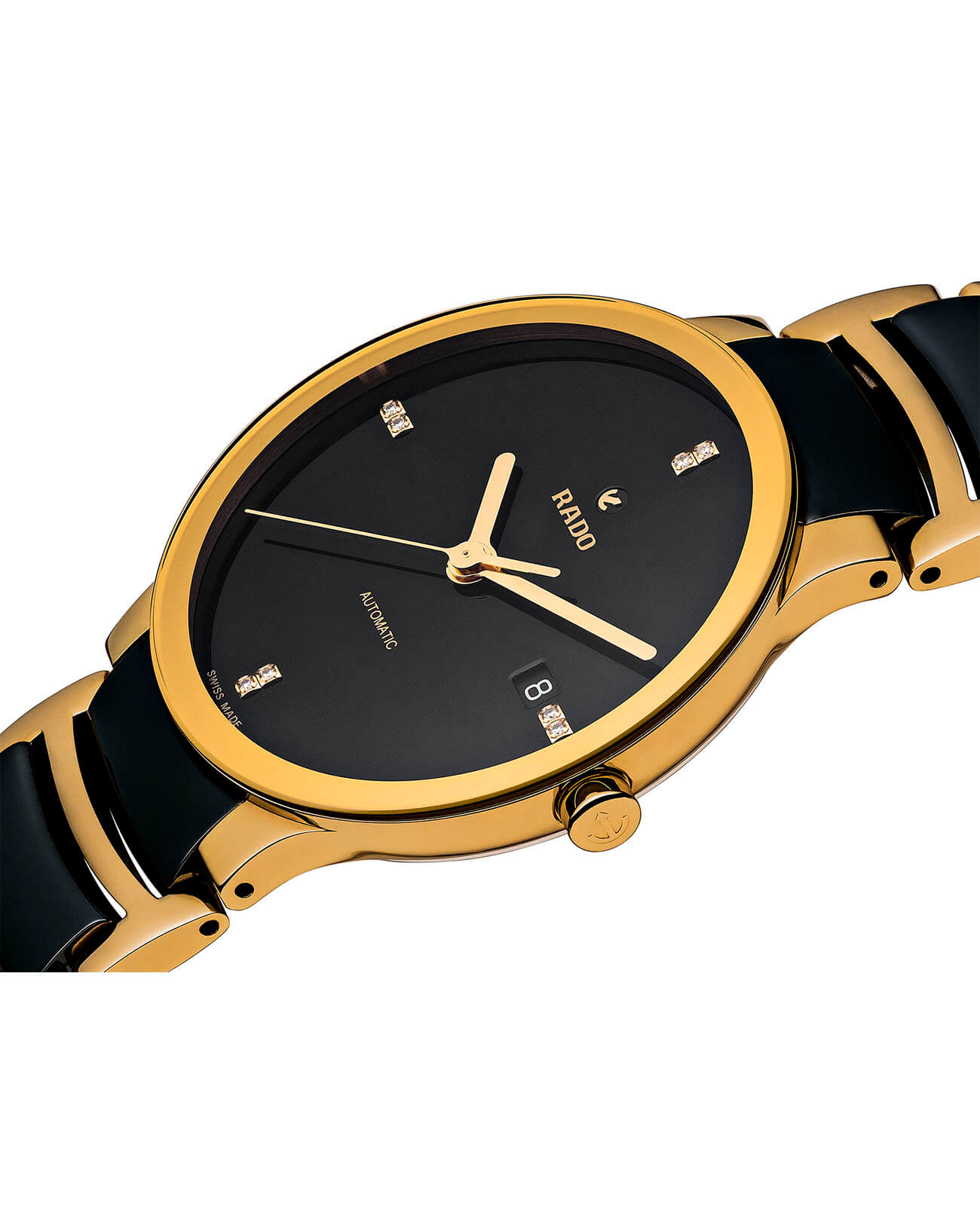 Аксессуар отличается элегантной лаконичностью, такая модель предоставляет возможность почувствовать себя настоящей леди. Циферблат, выполненный в стиле минимализм, привлекает блеском драгоценных камней - в качестве декорирующих элементов использовано 8 бриллиантов в 0,030 карат. Часы обеспечивают отменную точность хода благодаря швейцарскому автоматическому механизму ETA C07.611, его запас хода рассчитан на 80 часов. Оригинально смотрится браслет из нержавеющей стали 316L с золотистым PVD-покрытиемPVDУльтратонкое покрытие наносится в технике вакуумного напыления, сочетает в себе нитрид титана особой прочности со слоем золота или оксида хрома. Несёт в себе декоративную или защитную функцию. и высокотехнологичной керамикиВысокотехнологичная керамикаИнновационный запатентованный Rado материал с гладкой или матовой поверхностью. Керамика за счёт кристаллической структуры обладает повышенной устойчивостью от возникновения царапин. Материал способен принимать температуру тела человека, обеспечивая невероятный комфорт при ношении.. Сапфировое стекло препятствует образованию царапин. Водонепроницаемость 30 метров. . Апертура даты. Диаметр корпуса: 38 мм.