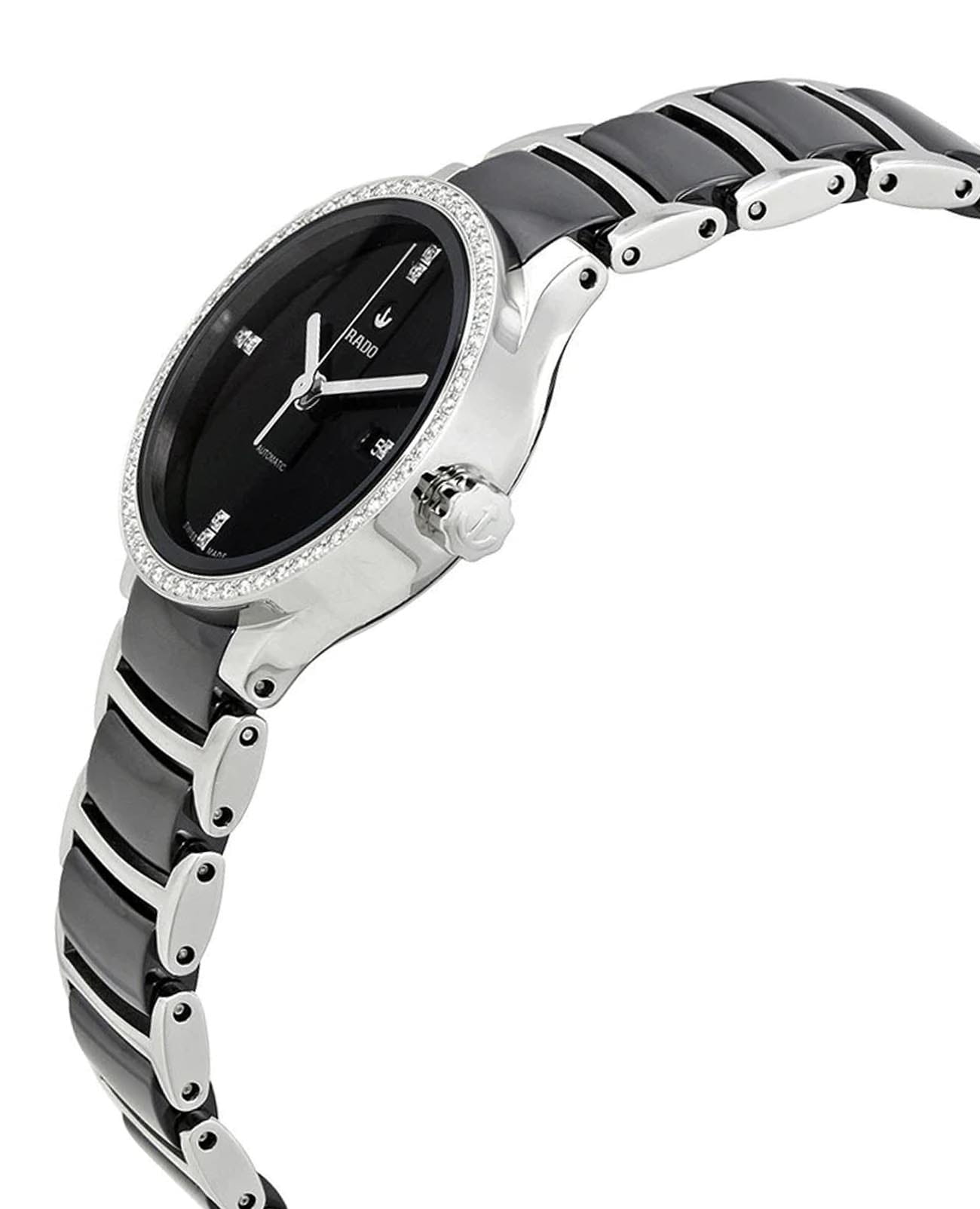 Женские швейцарские часы с автоподзаводом Rado Centrix Automatic Diamonds R30160712. Сапфировое стеклоСапфировое стеклоПрочный и надёжный материал из кристалла сапфира синтетического происхождения, характеризующийся особой твёрдостью и устойчивостью к царапинам и повреждениям. устойчивое к мелким механическим повреждениям. Браслет из стали и высокотехнологичной керамикиВысокотехнологичная керамикаИнновационный запатентованный Rado материал с гладкой или матовой поверхностью. Керамика за счёт кристаллической структуры обладает повышенной устойчивостью от возникновения царапин. Материал способен принимать температуру тела человека, обеспечивая невероятный комфорт при ношении. на раскладной застёжкеРаскладная застёжкаТакой тип застёжки используется только на браслетах из металла. Она никогда не раскрывается полностью, происходит разделение на 2 и более частей. Раскладывающая застёжка снизит вероятность потери часов к минимуму.. Корпус часов изготовлен из нержавеющей стали. Окошко даты находится в положении 3 часа. Циферблат и безельБезельВнешний ободок, закрепляющий стекло. В спортивных часах так называется поворотное кольцо с делениями на циферблате, выполняет роль таймера – замеряет отрезки времени на шкале. Неподвижный безель – элемент декора. Однонаправленно вращающийся безель на дайверских часах позволяет фиксировать моменты погружения и выныривания на поверхность. инкрустирован бриллиантами. Класс водозащиты: 30 метров, позволит защитить корпус от случайных брызг или капель дождя.