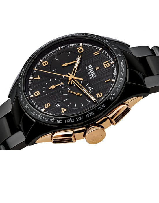 Представительские часы, способные по-настоящему преобразить индивидуальный образ, сделаны из высококачественных революционных материалов. Для корпуса использовали долговечную хирургическую сталь 316L с частичным PVD-покрытиемPVDУльтратонкое покрытие наносится в технике вакуумного напыления, сочетает в себе нитрид титана особой прочности со слоем золота или оксида хрома. Несёт в себе декоративную или защитную функцию. и высокотехнологичную керамикуВысокотехнологичная керамикаИнновационный запатентованный Rado материал с гладкой или матовой поверхностью. Керамика за счёт кристаллической структуры обладает повышенной устойчивостью от возникновения царапин. Материал способен принимать температуру тела человека, обеспечивая невероятный комфорт при ношении., браслет также сделан керамическим. Автоматический хронографХронографФункция позволяет измерять отрезки времени с особой точностью: часы, минуты, секунды. Верным признаком хронографа является наличие на циферблате 3 дополнительных окошек-счётчиков. оснащён механизмом ETA 2894-2 с запасом хода 45 часов. Прозрачная задняя крышка. Стекло из сапфира с антибликовой поверхностью. Водозащита 100 метров. Секундомер, тахиметрТахиметрРазмеченная шкала, располагается на ободке или безеле часов. Тахиметр позволяет рассчитать скорость на определённом участке пути, расстояние измеряется в километрах или милях., апертура даты. Диаметр корпуса: 45 мм.