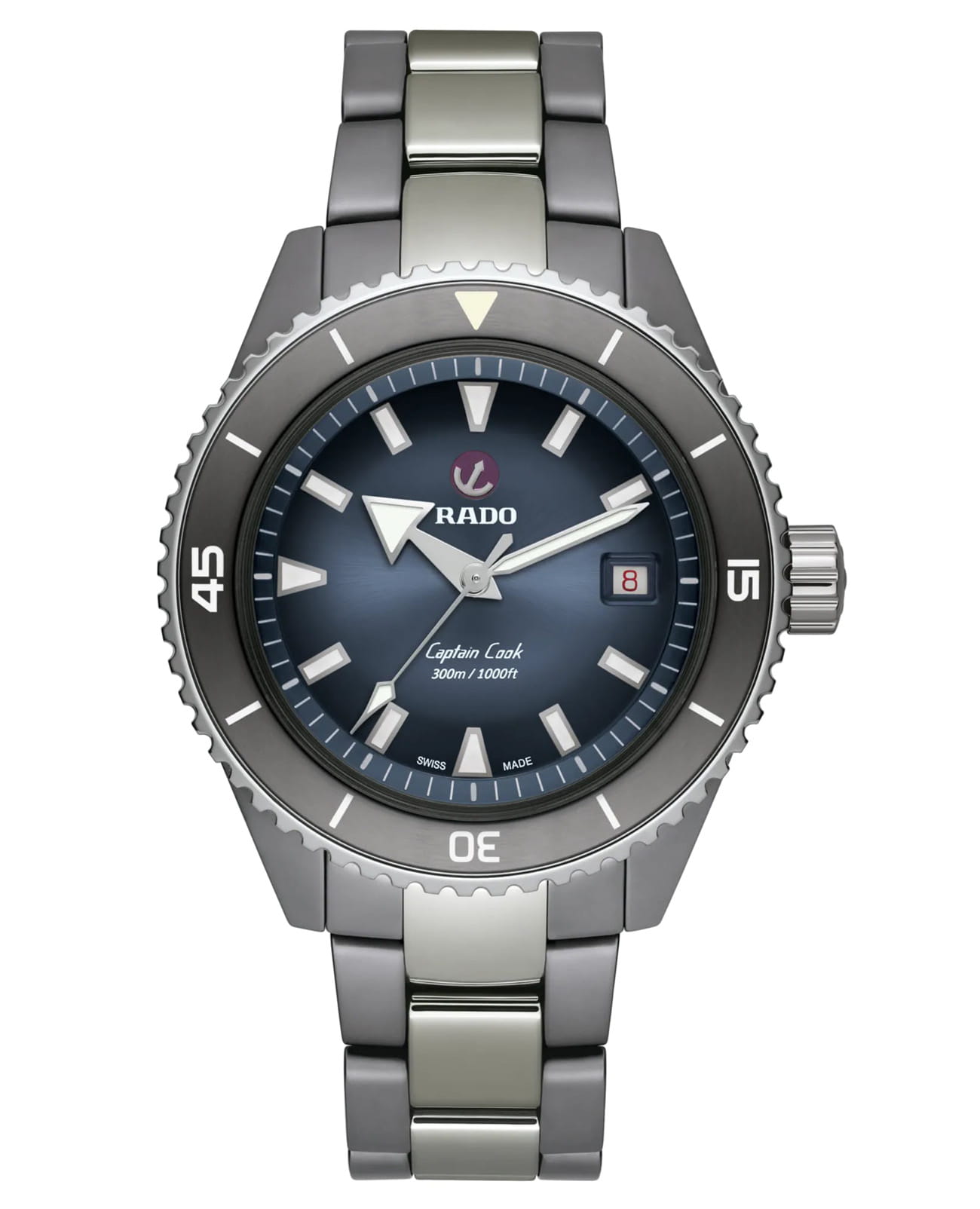 Высокотехнологичные керамические часы Captain Cook для дайверов (300 WR). Стрелки и индексы дайверских часов, сертифицированных по стандарту ISO 6425, покрыты SuperLuminova®, что обеспечивает отличную видимость на синем лакированном и полированном циферблате. 43-миллиметровый моноблочный корпус изготовлен из матовой плазменной высокотехнологичной керамикиВысокотехнологичная плазменная керамикаИнновационный материал, технология запатентована. Выплавление керамики осуществляется в печи при 20 000 °C, белоснежный материал под воздействием ультравысокой температуры приобретает уникальный блеск, присущий металлам., а вращающийся безельБезельВнешний ободок, закрепляющий стекло. В спортивных часах так называется поворотное кольцо с делениями на циферблате, выполняет роль таймера – замеряет отрезки времени на шкале. Неподвижный безель – элемент декора. Однонаправленно вращающийся безель на дайверских часах позволяет фиксировать моменты погружения и выныривания на поверхность. - из полированной нержавеющей стали. Внутри механизм Rado R763 с автоподзаводом превосходит стандартные требования по проверке точности в 3-5 положениях и обеспечивает 80 часов запаса хода. Эта модель поставляется с полированным плазменным высокотехнологичным керамическим браслетом. Какой бы ни была ваша область исследований, ваш высокотехнологичный керамический дайвер Captain Cook станет надежным партнером на долгие годы.