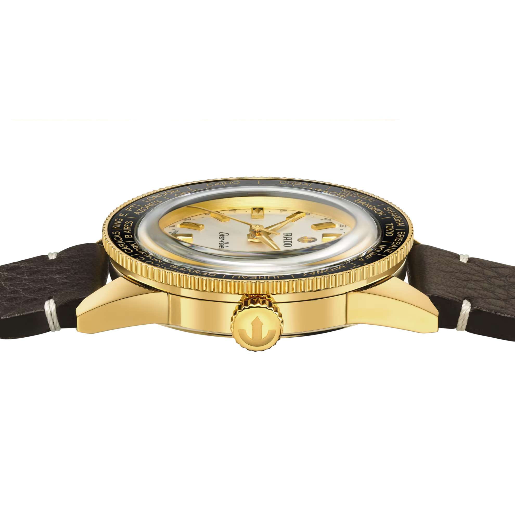 Мужские механические часы с ручным подзаводом Rado Captain Cook Over-Pole — это возвращение культовой модели в лимитированном издании. Корпус диаметром 39 мм и толщиной 10,9 мм выполнен из нержавеющей стали с PVD-покрытиемPVDУльтратонкое покрытие наносится в технике вакуумного напыления, сочетает в себе нитрид титана особой прочности со слоем золота или оксида хрома. Несёт в себе декоративную или защитную функцию. жёлтого золота. БезельБезельВнешний ободок, закрепляющий стекло. В спортивных часах так называется поворотное кольцо с делениями на циферблате, выполняет роль таймера – замеряет отрезки времени на шкале. Неподвижный безель – элемент декора. Однонаправленно вращающийся безель на дайверских часах позволяет фиксировать моменты погружения и выныривания на поверхность. — стальной с вставкой из высокотехнологичной керамикиВысокотехнологичная керамикаИнновационный запатентованный Rado материал с гладкой или матовой поверхностью. Керамика за счёт кристаллической структуры обладает повышенной устойчивостью от возникновения царапин. Материал способен принимать температуру тела человека, обеспечивая невероятный комфорт при ношении. жёлтого цвета. Циферблат оформлен индексами и стрелками с люминесцентным покрытиемЛюминесцентное покрытиеПозволяет считывать показания времени в темноте. Производители наносят на стрелки, часовые индексы, безель или поверхность циферблата светонакопительный состав, дающий холодное свечение. Super-Luminova®, обеспечивающим хорошую читаемость в темноте. Циферблат защищён сапфировым стекломСапфировое стеклоПрочный и надёжный материал из кристалла сапфира синтетического происхождения, характеризующийся особой твёрдостью и устойчивостью к царапинам и повреждениям.. Механизм с функцией мирового времениМировое время Полезное часовое усложнение, отображающее время в основных городах и известных областях по всему миру, оно связано с часовыми поясами, удобно для путешественников и бизнесменов. , антимагнитной пружиной Nivachron™Nivachron™Специально разработанный инновационный сплав Nivachron™ повышает устойчивость часов к воздействию магнитных полей., отрегулированный в пяти положениях, с запасом хода 80 часов. Декор механизма — узор «Côtes de Genève», синие винты и золотистые детали. Прозрачная задняя крышка с сапфировым стеклом и завинчивающимся креплением позволяет наблюдать за работой механизма. Часы оснащены стальным браслетом с PVD-покрытиемPVDУльтратонкое покрытие наносится в технике вакуумного напыления, сочетает в себе нитрид титана особой прочности со слоем золота или оксида хрома. Несёт в себе декоративную или защитную функцию. жёлтого золота и трёхсекционной застёжкой. В комплекте коричневый кожаный ремешок и удобная кожаная сумка для хранения. Смена браслета осуществляется с помощью системы . Водонепроницаемость 100 м позволяет использовать часы для плавания. Идеальный выбор для ценителя эксклюзивности, сложных функций и швейцарского мастерства.