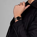 БезельБезельВнешний ободок, закрепляющий стекло. В спортивных часах так называется поворотное кольцо с делениями на циферблате, выполняет роль таймера – замеряет отрезки времени на шкале. Неподвижный безель – элемент декора. Однонаправленно вращающийся безель на дайверских часах позволяет фиксировать моменты погружения и выныривания на поверхность. выполнен из стали с PVD-покрытиемPVDУльтратонкое покрытие наносится в технике вакуумного напыления, сочетает в себе нитрид титана особой прочности со слоем золота или оксида хрома. Несёт в себе декоративную или защитную функцию., что придаёт часам изысканный блеск и дополнительную защиту от износа. Окошко даты расположено в положении 6 часов, предоставляющее удобный доступ к актуальной дате. Циферблат инкрустирован бриллиантами, что добавляет часам нотку роскоши и изысканности.