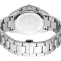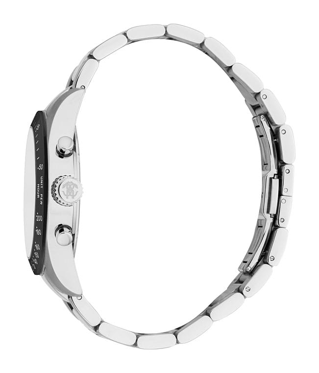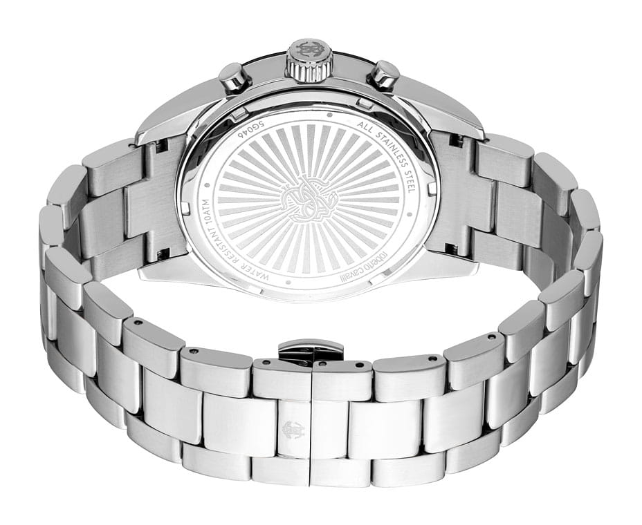 ROBERTO CAVALLI Uomo Chrono RC5G046M1055 — стильные итальянские часы с функцией хронографаХронографФункция позволяет измерять отрезки времени с особой точностью: часы, минуты, секунды. Верным признаком хронографа является наличие на циферблате 3 дополнительных окошек-счётчиков., которые сочетают в себе элегантность и современный функционал. Круглый корпус диаметром 42 мм выполнен из нержавеющей стали, толщина корпуса составляет 12 мм, что придает модели выразительный внешний вид и надежную защиту от внешних воздействий. Часы оснащены кварцевым механизмом, также обладают функцией отображения даты, что делает их удобными для ежедневного использования. Минеральное стеклоМинеральное стеклоМинеральное стекло представляет собой искусственно выращенный минерал кварца. Такое стекло отличается особой устойчивостью к повреждениям и царапинам. Уступает по некоторым качествам сапфировому стеклу. защищает часы от царапин. Водозащита 100 метров, позволит плавать, нырять и заниматься другими водными видами спорта. Неподвижный безельБезельВнешний ободок, закрепляющий стекло. В спортивных часах так называется поворотное кольцо с делениями на циферблате, выполняет роль таймера – замеряет отрезки времени на шкале. Неподвижный безель – элемент декора. Однонаправленно вращающийся безель на дайверских часах позволяет фиксировать моменты погружения и выныривания на поверхность. с PVD-покрытиемPVDУльтратонкое покрытие наносится в технике вакуумного напыления, сочетает в себе нитрид титана особой прочности со слоем золота или оксида хрома. Несёт в себе декоративную или защитную функцию.. Стальной браслет на застёжке-бабочке с кнопкамиЗастёжка "бабочка"Такой вид застёжки дополняется предохранителями, помогающими избежать случайного раскрытия браслета. Обладают изящным исполнением. обеспечивает комфортное ношение. Стрелки с люминесцентным покрытиемЛюминесцентное покрытиеПозволяет считывать показания времени в темноте. Производители наносят на стрелки, часовые индексы, безель или поверхность циферблата светонакопительный состав, дающий холодное свечение. обеспечивают отличную читаемость в любое время суток.
