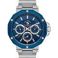 Мужские кварцевые часы Santa Barbara Polo & Racquet Club — это удобный и функциональный аксессуар на каждый день. Корпус диаметром 45 мм выполнен из стали 316L. БезельБезельВнешний ободок, закрепляющий стекло. В спортивных часах так называется поворотное кольцо с делениями на циферблате, выполняет роль таймера – замеряет отрезки времени на шкале. Неподвижный безель – элемент декора. Однонаправленно вращающийся безель на дайверских часах позволяет фиксировать моменты погружения и выныривания на поверхность. с  IP-покрытиемIP-покрытиеМетод ионного напыления. Демонстрирует повышенную устойчивость к истиранию, окислению и химическим веществам. Под воздействием высокого давления и температуры около 1500°C молекулы металла надёжно соединяются с частицами корпуса часов.. Циферблат синего цвета двухуровневой конструкции оформлен штрихами и скелетонизированными стрелками. Присутствуют отдельные индикаторы дня недели и даты, а также 24-часовой формат времени. Стрелки и метки с люминесцентным покрытиемЛюминесцентное покрытиеПозволяет считывать показания времени в темноте. Производители наносят на стрелки, часовые индексы, безель или поверхность циферблата светонакопительный состав, дающий холодное свечение., обеспечивающим хорошую читаемость в темноте. Циферблат защищён минеральным стекломМинеральное стеклоМинеральное стекло представляет собой искусственно выращенный минерал кварца. Такое стекло отличается особой устойчивостью к повреждениям и царапинам. Уступает по некоторым качествам сапфировому стеклу.. Часы оснащены стальным браслетом на застёжке «бабочка» с кнопкамиЗастёжка "бабочка"Такой вид застёжки дополняется предохранителями, помогающими избежать случайного раскрытия браслета. Обладают изящным исполнением. . Водонепроницаемость 30 м позволяет использовать часы в повседневных условиях. Идеальный выбор для тех, кто ценит американское качество и универсальный дизайн.
