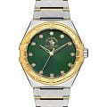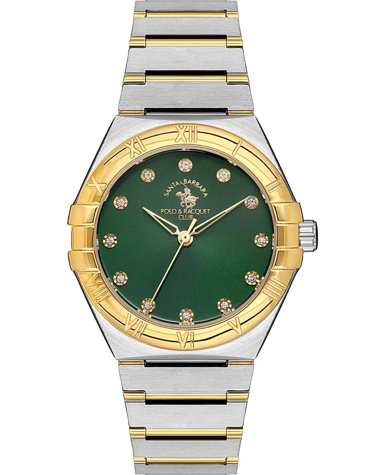 Женские кварцевые часы Santa Barbara Polo & Racquet Club — это элегантный аксессуар, притягивающий восхищённые взгляды. Корпус диаметром 34 мм и высотой 36 мм выполнен из стали с частичным IP-покрытиемIP-покрытиеМетод ионного напыления. Демонстрирует повышенную устойчивость к истиранию, окислению и химическим веществам. Под воздействием высокого давления и температуры около 1500°C молекулы металла надёжно соединяются с частицами корпуса часов.. БезельБезельВнешний ободок, закрепляющий стекло. В спортивных часах так называется поворотное кольцо с делениями на циферблате, выполняет роль таймера – замеряет отрезки времени на шкале. Неподвижный безель – элемент декора. Однонаправленно вращающийся безель на дайверских часах позволяет фиксировать моменты погружения и выныривания на поверхность. оформлен римскими цифрами, придавая дизайну классическую выразительность. Циферблат зелёного цвета выполнен по технологии Sunray («солнечные лучи»), дополнен накладными метками в виде точек, инкрустированных кристаллами, а также фирменным логотипом. Циферблат защищён минеральным стекломМинеральное стеклоМинеральное стекло представляет собой искусственно выращенный минерал кварца. Такое стекло отличается особой устойчивостью к повреждениям и царапинам. Уступает по некоторым качествам сапфировому стеклу.. Механизм — кварцевый калибр Miyota 2035. Часы оснащены стальным браслетом с частичным IP-покрытиемIP-покрытиеМетод ионного напыления. Демонстрирует повышенную устойчивость к истиранию, окислению и химическим веществам. Под воздействием высокого давления и температуры около 1500°C молекулы металла надёжно соединяются с частицами корпуса часов. и раскладной застёжкойРаскладная застёжкаТакой тип застёжки используется только на браслетах из металла. Она никогда не раскрывается полностью, происходит разделение на 2 и более частей. Раскладывающая застёжка снизит вероятность потери часов к минимуму.. Водонепроницаемость 50 м позволяет использовать часы в повседневных условиях. Идеальный выбор для тех, кто ценит блеск, стиль и качество.