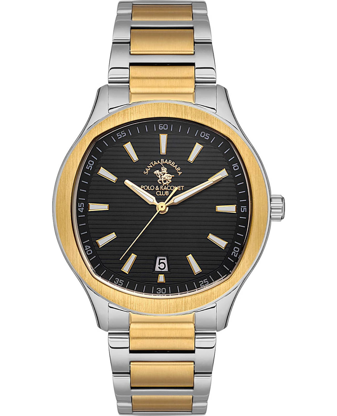 Мужские кварцевые часы Santa Barbara Polo & Racquet Club — это воплощение стиля и практичности. Корпус диаметром 41 мм и высотой 46,5 мм выполнен из стали. безельБезельВнешний ободок, закрепляющий стекло. В спортивных часах так называется поворотное кольцо с делениями на циферблате, выполняет роль таймера – замеряет отрезки времени на шкале. Неподвижный безель – элемент декора. Однонаправленно вращающийся безель на дайверских часах позволяет фиксировать моменты погружения и выныривания на поверхность. с частичным IP-покрытиемIP-покрытиеМетод ионного напыления. Демонстрирует повышенную устойчивость к истиранию, окислению и химическим веществам. Под воздействием высокого давления и температуры около 1500°C молекулы металла надёжно соединяются с частицами корпуса часов.. Циферблат чёрного цвета матовой текстуры украшен фирменным логотипом и накладными метками в виде штрихов. Окошко даты расположено в положении 6 часов. Стрелки с люминесцентным покрытиемЛюминесцентное покрытиеПозволяет считывать показания времени в темноте. Производители наносят на стрелки, часовые индексы, безель или поверхность циферблата светонакопительный состав, дающий холодное свечение., обеспечивающим хорошую читаемость в темноте. Циферблат защищён минеральным стекломМинеральное стеклоМинеральное стекло представляет собой искусственно выращенный минерал кварца. Такое стекло отличается особой устойчивостью к повреждениям и царапинам. Уступает по некоторым качествам сапфировому стеклу.. Часы оснащены стальным браслетом с частичным IP-покрытиемIP-покрытиеМетод ионного напыления. Демонстрирует повышенную устойчивость к истиранию, окислению и химическим веществам. Под воздействием высокого давления и температуры около 1500°C молекулы металла надёжно соединяются с частицами корпуса часов. и раскладной застёжкойРаскладная застёжкаТакой тип застёжки используется только на браслетах из металла. Она никогда не раскрывается полностью, происходит разделение на 2 и более частей. Раскладывающая застёжка снизит вероятность потери часов к минимуму.. Водонепроницаемость 50 м позволяет использовать часы в повседневных условиях. Идеальный выбор для тех, кто ценит качество, стиль и уверенность в себе.