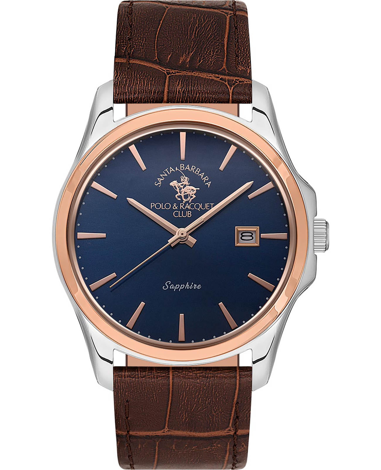 Мужские кварцевые часы Santa Barbara Polo & Racquet Club — это сдержанный и элегантный аксессуар для делового образа. Корпус диаметром 41 мм и высотой 50 мм выполнен из нержавеющей стали 316L. БезельБезельВнешний ободок, закрепляющий стекло. В спортивных часах так называется поворотное кольцо с делениями на циферблате, выполняет роль таймера – замеряет отрезки времени на шкале. Неподвижный безель – элемент декора. Однонаправленно вращающийся безель на дайверских часах позволяет фиксировать моменты погружения и выныривания на поверхность. из стали с IP-покрытиемIP-покрытиеМетод ионного напыления. Демонстрирует повышенную устойчивость к истиранию, окислению и химическим веществам. Под воздействием высокого давления и температуры около 1500°C молекулы металла надёжно соединяются с частицами корпуса часов.. Циферблат синего цвета оформлен по технологии Sunray («солнечные лучи»), дополнен накладными метками в виде штрихов и фирменным логотипом. Окошко даты расположено в положении 3 часов. Стрелки мечевидной формы. Циферблат защищён минеральным стеклом. Часы оснащены кожаным ремешком с застёжкой «бабочка» с кнопкамиЗастёжка "бабочка"Такой вид застёжки дополняется предохранителями, помогающими избежать случайного раскрытия браслета. Обладают изящным исполнением. . Водонепроницаемость 50 м позволяет использовать часы в повседневных условиях. Идеальный выбор для тех, кто ценит стиль, надёжность и деловую эстетику.