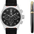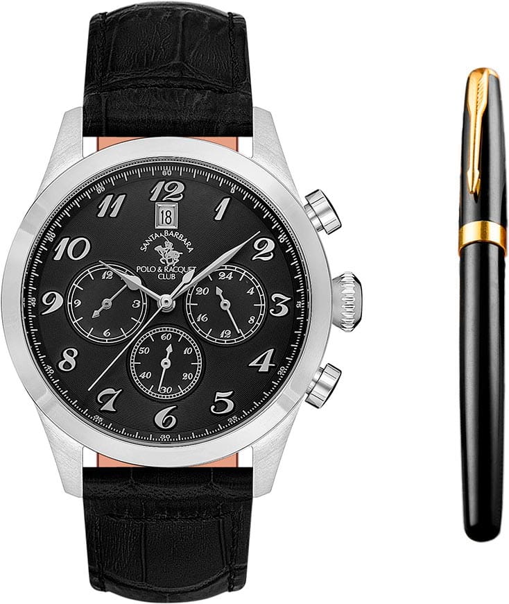 Мужские кварцевые Santa Barbara Polo & Racquet Club SB.1.10551-1 — воплощение элегантности и технического совершенства. Корпус из нержавеющей стали серебристого цвета, диаметром 43 мм, что делает их устойчивыми к внешним воздействиям и придает благородный вид. Циферблат украшен фирменным логотипом и защищён минеральным стекломМинеральное стеклоМинеральное стекло представляет собой искусственно выращенный минерал кварца. Такое стекло отличается особой устойчивостью к повреждениям и царапинам. Уступает по некоторым качествам сапфировому стеклу., устойчивое к царапинам и механическим повреждениям. Кожаный ремешок на стандартной застежке обеспечивает комфортное и безопасное ношение. Рифленая заводная головка. 12-ти и 24-х часовой формат. Окошко даты находится в положении 12 часов. Водонепроницаемость 50 метров позволит защитить корпус от случайных брызг или капель дождя. Идеальный выбор для тех, кто ценит элегантный дизайн и качество. Подарочный набор - функциональные мужские часы и ручка.