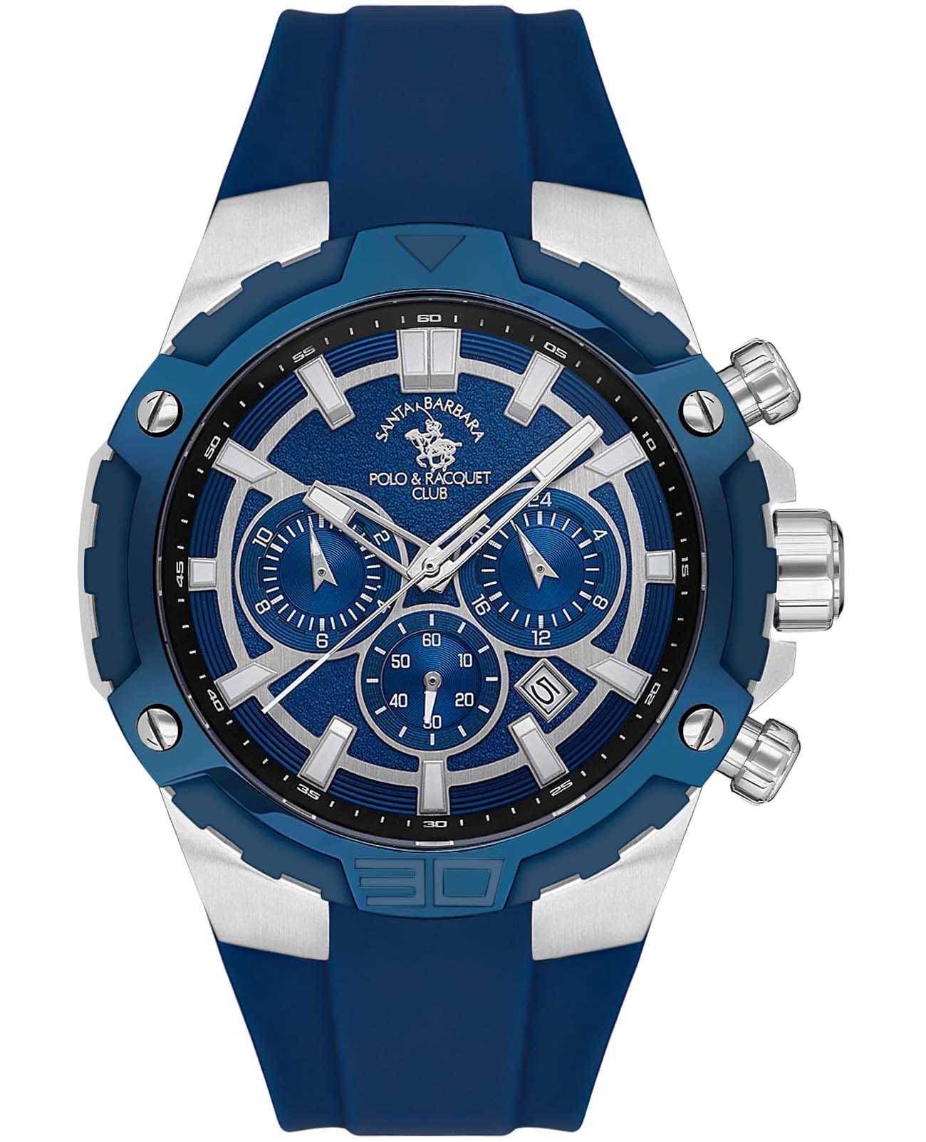 Мужские кварцевые Santa Barbara Polo & Racquet Club SB.5.10002-3 — воплощение элегантности и технического совершенства. Корпус из нержавеющей стали серебристого цвета, диаметром 47 мм, что делает их устойчивыми к внешним воздействиям и придает благородный вид. Стрелки и метки с люминесцентным покрытиемЛюминесцентное покрытиеПозволяет считывать показания времени в темноте. Производители наносят на стрелки, часовые индексы, безель или поверхность циферблата светонакопительный состав, дающий холодное свечение., обеспечивающим хорошую читаемость в темноте. Циферблат защищён минеральным стекломМинеральное стеклоМинеральное стекло представляет собой искусственно выращенный минерал кварца. Такое стекло отличается особой устойчивостью к повреждениям и царапинам. Уступает по некоторым качествам сапфировому стеклу. устойчивое к царапинам и механическим повреждениям. 12-ти и 24-х часовой формат времени. Неподвижный безельБезельВнешний ободок, закрепляющий стекло. В спортивных часах так называется поворотное кольцо с делениями на циферблате, выполняет роль таймера – замеряет отрезки времени на шкале. Неподвижный безель – элемент декора. Однонаправленно вращающийся безель на дайверских часах позволяет фиксировать моменты погружения и выныривания на поверхность. с IP-покрытиемIP-покрытиеМетод ионного напыления. Демонстрирует повышенную устойчивость к истиранию, окислению и химическим веществам. Под воздействием высокого давления и температуры около 1500°C молекулы металла надёжно соединяются с частицами корпуса часов. синего цвета. Окошко даты находится между отметками 4 и 5 часов. Силиконовый ремешок на стандартной застёжке обеспечивает комфортное и безопасное ношение. Рифленая заводная головка с защитой. Водонепроницаемость 100 метров позволит плавать, нырять и заниматься другими водными видами спорта. Идеальный выбор для тех, кто ценит элегантный дизайн и качество.