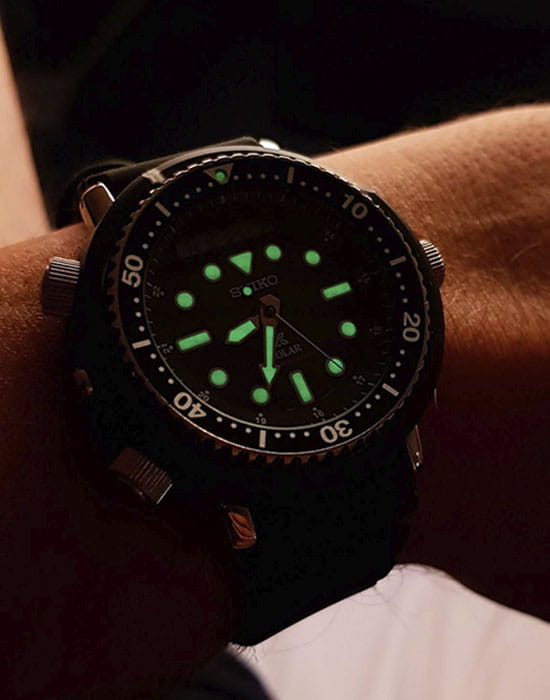 Наручные часы отражают брутальный, спортивный характер. Внешний облик позаимствован у предшественника Seiko H558-5009, выполненный в дайверском стиле. Дизайн прослеживается в однонаправленно вращающемся безелеБезельВнешний ободок, закрепляющий стекло. В спортивных часах так называется поворотное кольцо с делениями на циферблате, выполняет роль таймера – замеряет отрезки времени на шкале. Неподвижный безель – элемент декора. Однонаправленно вращающийся безель на дайверских часах позволяет фиксировать моменты погружения и выныривания на поверхность., крупной индикации времени, оформлении кнопок. Аксессуар работает за счёт японского кварцевого калибра Seiko H851, получающего энергию за счёт источников света – реализация технологии . При полностью заряженном элементе питания модель проработает 6 месяцев без необходимости подзарядки. Противоударный корпусУдаропрочный корпусМеханизм заключён в корпус, выполненный из современных материалов, устойчивых к ударам, механическим повреждениям и падению с высоты: инновационный пластик, карбон, нержавеющая сталь, титан. имеет двойную конструкцию, где нержавеющая сталь 316L дополнительно защищена полимерными протекторами. Циферблат оснащён минеральным закаленным стеклом Hardlex, прочным и устойчивым к царапинам. Сохраняется водостойкость до 200 метров в соответствии со стандартом ISO 6425. Дисплей подсвечивается светодиодомСветодиодная подсветкаСветодиодная или LED-подсветка обеспечивает появление яркого холодного свечения за счёт LED-элементов - маленьких лампочек. Они потребляют минимальное количество энергии, чаще всего можно встретить 1 светодиод, в нижней части циферблата., стрелки и индексы имеют люминесцентную подсветкуЛюминесцентное покрытиеПозволяет считывать показания времени в темноте. Производители наносят на стрелки, часовые индексы, безель или поверхность циферблата светонакопительный состав, дающий холодное свечение.. Функции: будильник, секундомер, вечный календарьВечный календарьКлассическое часовое усложнение, представляющее собой календарь, рассчитанный на несколько лет вперёд (стандартно – до 2099 года). Определяет текущую дату, день недели, месяц.. Диаметр корпуса: 47,8 мм.