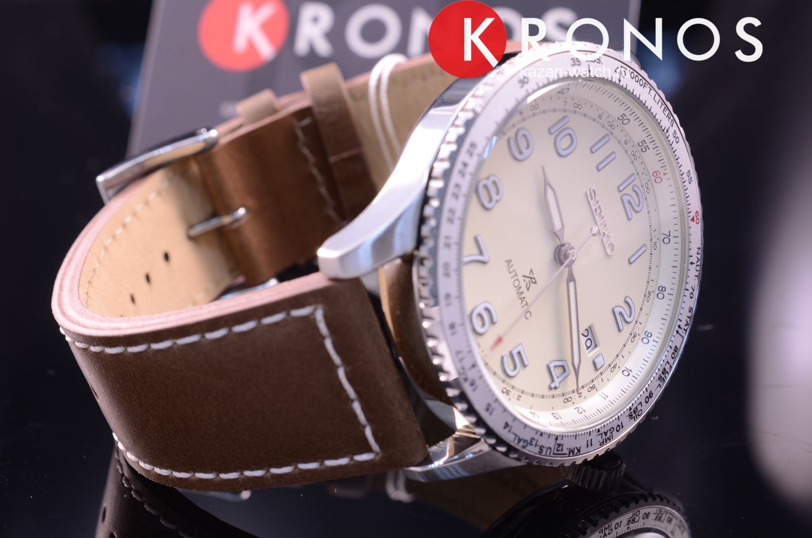 Работу часов обеспечивает японский пружинный механизм 4R35 с возможностью автоматического и ручного завода. Запас хода калибра рассчитан на 40 часов. Вращающийся безельБезельВнешний ободок, закрепляющий стекло. В спортивных часах так называется поворотное кольцо с делениями на циферблате, выполняет роль таймера – замеряет отрезки времени на шкале. Неподвижный безель – элемент декора. Однонаправленно вращающийся безель на дайверских часах позволяет фиксировать моменты погружения и выныривания на поверхность. дополнен логарифмической линейкой, на стрелки нанесено люминесцентное покрытиеЛюминесцентное покрытиеПозволяет считывать показания времени в темноте. Производители наносят на стрелки, часовые индексы, безель или поверхность циферблата светонакопительный состав, дающий холодное свечение.. Ремешок изготовлен из натуральной телячьей кожи, минеральное стекло Hardlex отличается повышенной устойчивостью к царапинам.