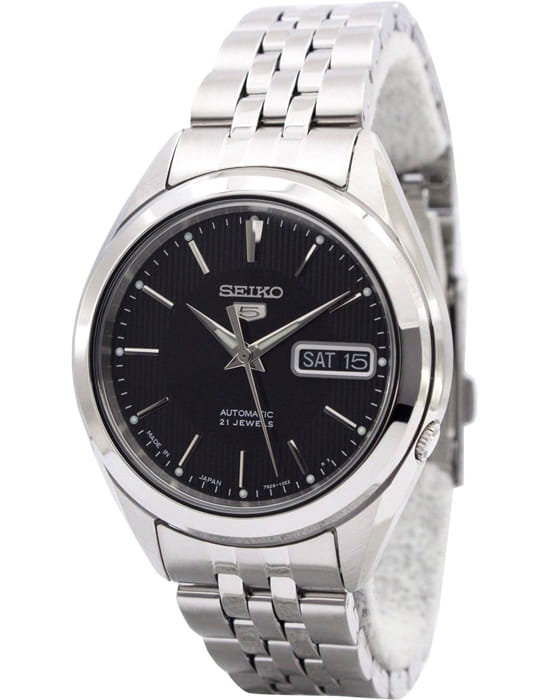 Мужские японские часы с запасом хода 41 час Seiko 5 SNKL23J1 с минеральным стекломМинеральное стеклоМинеральное стекло представляет собой искусственно выращенный минерал кварца. Такое стекло отличается особой устойчивостью к повреждениям и царапинам. Уступает по некоторым качествам сапфировому стеклу. повышенной прочности, механический механизм (автоматический калибр) с высокой точностью. Класс водозащиты: 30 метров, позволит защитить корпус от случайных брызг или капель дождя. Корпус и браслет часов изготовлен из стали. Браслет на раскладной застёжкеРаскладная застёжкаТакой тип застёжки используется только на браслетах из металла. Она никогда не раскрывается полностью, происходит разделение на 2 и более частей. Раскладывающая застёжка снизит вероятность потери часов к минимуму. с кнопками. Окошко даты и дня недели находятся в положении 3 часа. Заводная коронка находится на «4 часах». Стрелки и метки с люминесцентным покрытиемЛюминесцентное покрытиеПозволяет считывать показания времени в темноте. Производители наносят на стрелки, часовые индексы, безель или поверхность циферблата светонакопительный состав, дающий холодное свечение..